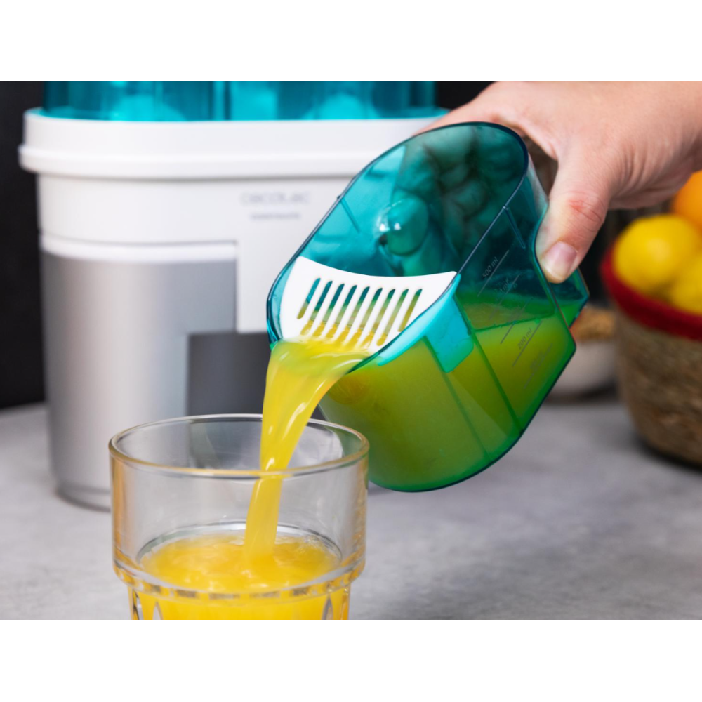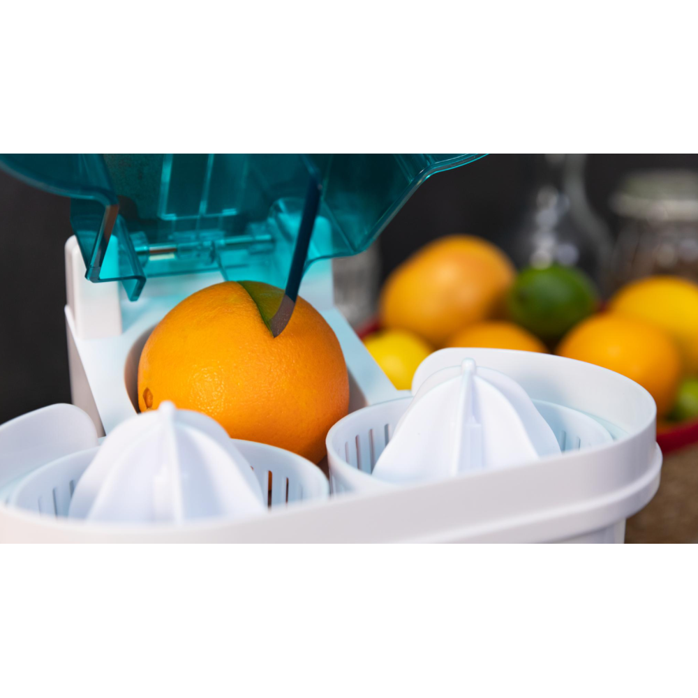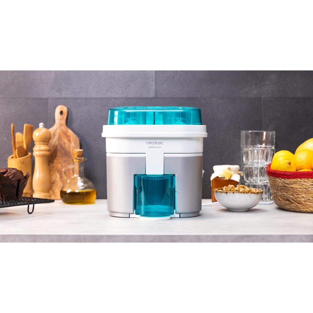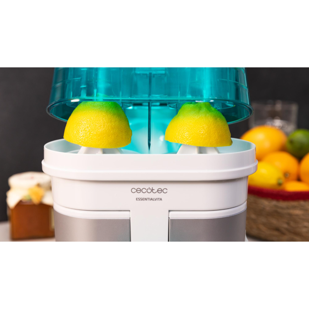 Presse- agrumes électrique Essential Vita Twice offrant une puissance de fonctionnement de 90 watts - Conçu avec un coupe-agrumes intégré - Couleur blanc/gris - Possède une double tête pour presser deux moitiés d'orange à la fois - Embarque un verre extractible avec 500 ml de capacité - S'adapte aux différentes tailles d'agrumes - Intègre des ventouses pour plus de stabilité - Fourni avec un filtre facile à nettoyer et compatible au lave-vaisselle.