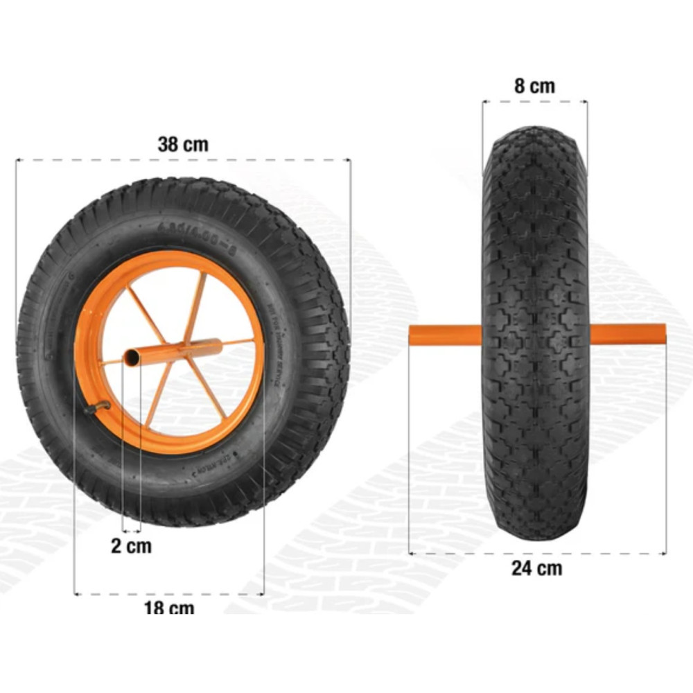 Idéal pour remplacer une roue de brouette défectueuse. La structure de la roue est en métal. Informations techniques. Roue grand diamètre de 380mm. Structure métal. Diamètre d'alésage de l'axe central : 16mm. Diamètre de la roue : 380. Roue spéciale pour brouette.
