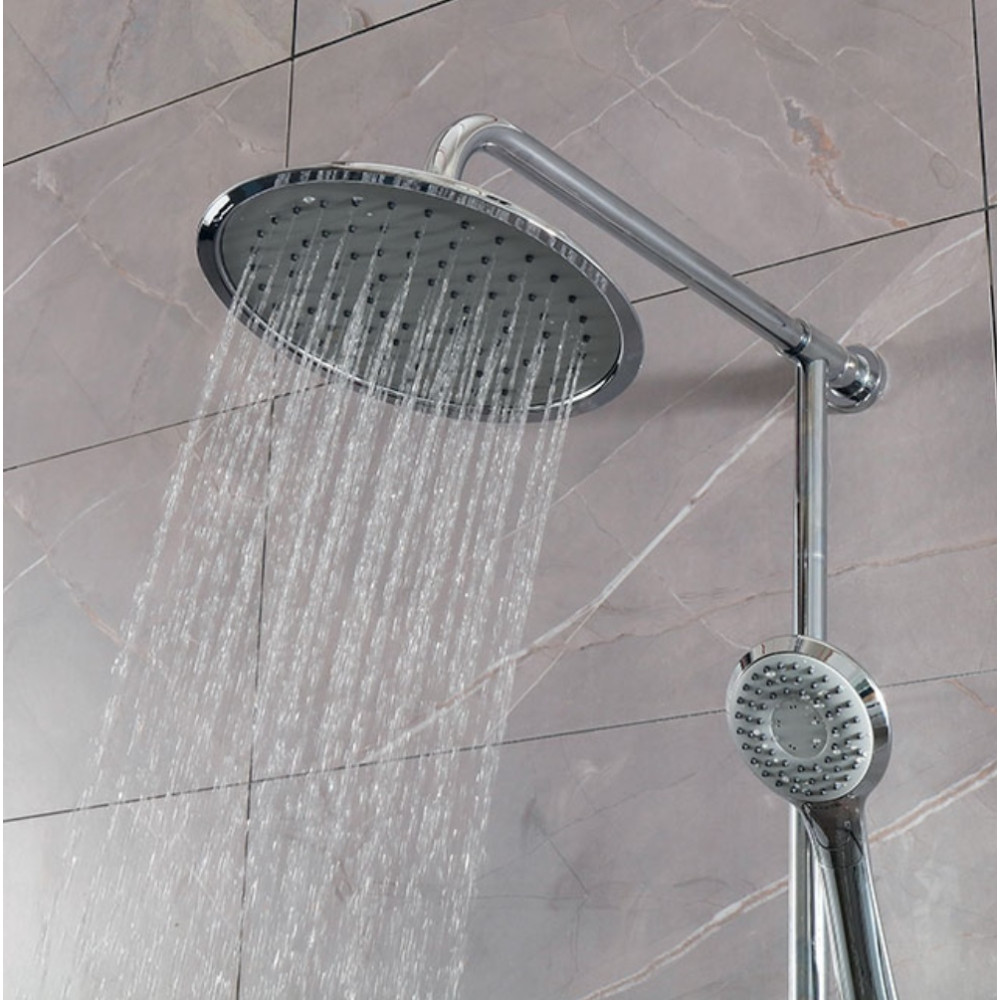 Dimension : Entraxe patères de fixation ajustable. Hauteur 80 < 113 cm, profondeur 54 cm - Mitigeur mécanique, Inverseur intégré avec disques céramiques - Pomme de tête : Pomme de douche avec écrou pivotant, haute qualité inox marine, anticalcaire de diamètre Ø23 cm, inox chromé et ABS, picots anticalcaire - Colonne : Colonne et mitigeur en laiton chromé - Douchette : 3 jets changement par bouton, consommation d'eau de 10 L/mn - Flexible d'1m50, Shiny anti-torsion très esthétique grâce à sa maille serrée, Connection simple à la robinetterie existante grâce au flexible de 50 cm fourni.