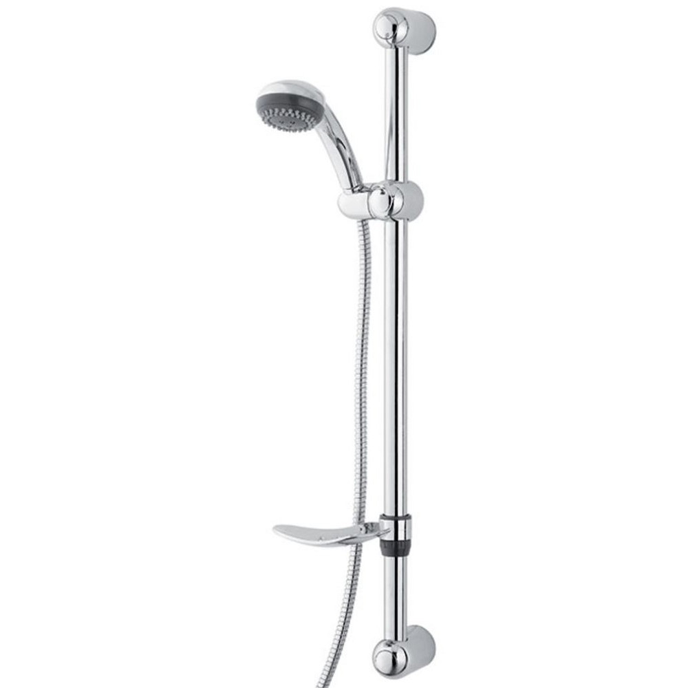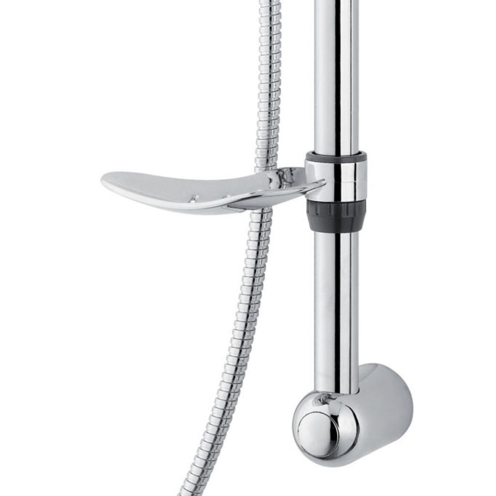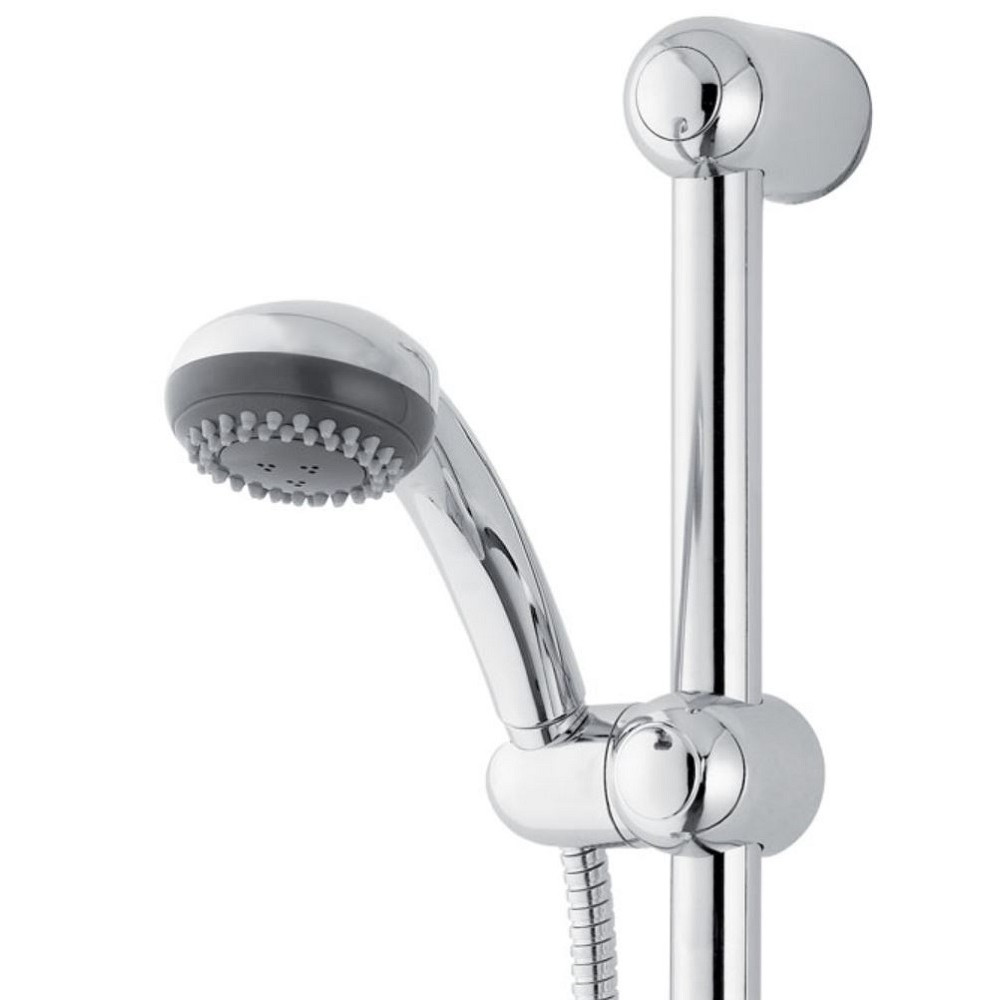 Kit de douche "Naisa" de la marque WIRQUIN - Barre de diamètre Ø2,5 cm en inox chromé. Entraxe réglable - Support de douchette : 1 position en ABS - Douchette 5 jets : pluie fine, pluie dense, massage, mousse, jet pluie + massage. Ø 12,5 cm - Changement de jet rotatif. Picots anticalcaire. Flexible. Inox chromé double agrafage - Longueur : 1,50 mètres.
