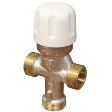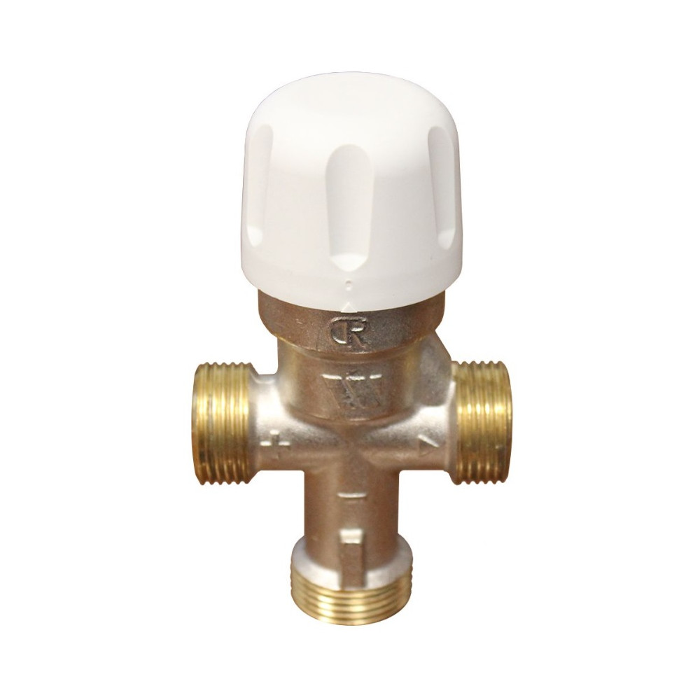 Mélange thermo statiquement l'eau chaude du générateur à l'eau froide de l'alimentation. Économise l'eau chaude en permettant de distribuer l'Eau Chaude Sanitaire à une température choisie et constante. Produit idéal pour réguler en toute sécurité la température des lavabos à robinetterie infrarouge. Corps laiton anticorrosion (NDZ). Construction très compacte. Vanne avec passage en « L » (convient à de nombreuses configurations d’installation). Clapets anti-retour intégrés (modèle 3/4”). Sortie d'eau mitigée sur le côté (arrivée eau froide par le dessous).