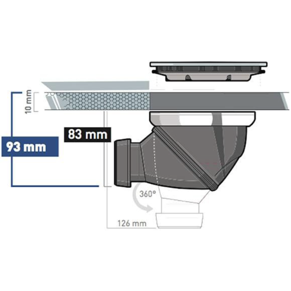 Bonde à chaper WIRQUIN 30722012 - Marque : WIRQUIN - Gamme : JAMES - Utilisation : Évacuation des eaux d'une douche à l'italienne - Installation horizontale : 93 mm, verticale : 126 mm - Garde d'eau : 50 mm - Raccordement : Ø 40 mm à coller ou visser - Ajustement : cale de rattrapage jusqu'à 12 mm - Finition : grille inox brossé 115 x 115 mm - Hauteur de la grille ajustable - Siphon orientable à 360 ° - Natte d'étanchéité prémontée - Débit : 27 à 34,5 l/mn - Diamètre des raccords : 40 mm - Forme : Plate - Trop-plein : Non - EAN : 3375537219315.