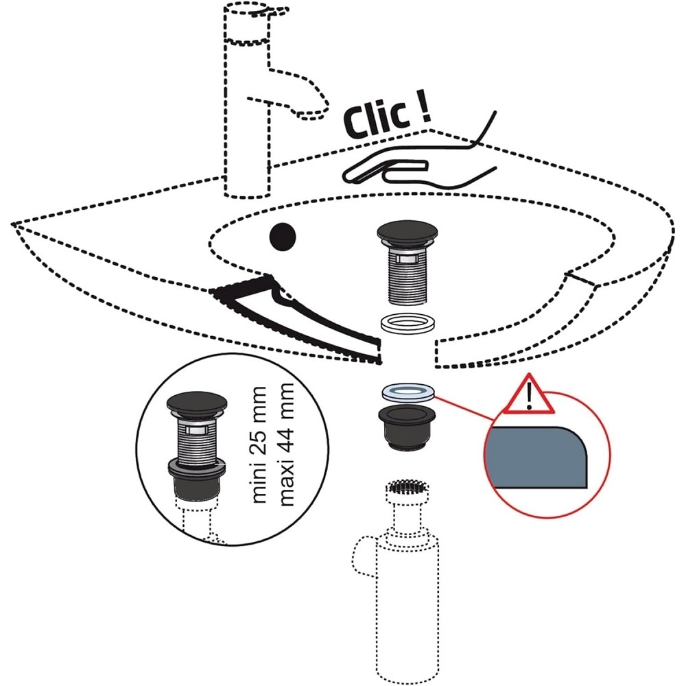 Ensemble Tout-en-Un (bonde + siphon) - Marque : Wirquin - Modèle : Tout-en-Un - Utilisation : Lavabo, vasque, lave-mains - Couleur : Gris métal, clapet chromé - Hauteur réglable : 45 à 115 mm - Trop-plein intégré : Oui - Système : Quick-Clac (ouverture/fermeture par pression) - Sortie universelle : Ø32 à Ø43 mm (push-fit) - Installation : Sans colle, sans outil - Norme : Certifié NF - Poids : 0,32 kg - Référence produit / GTIN : 3375537186365.