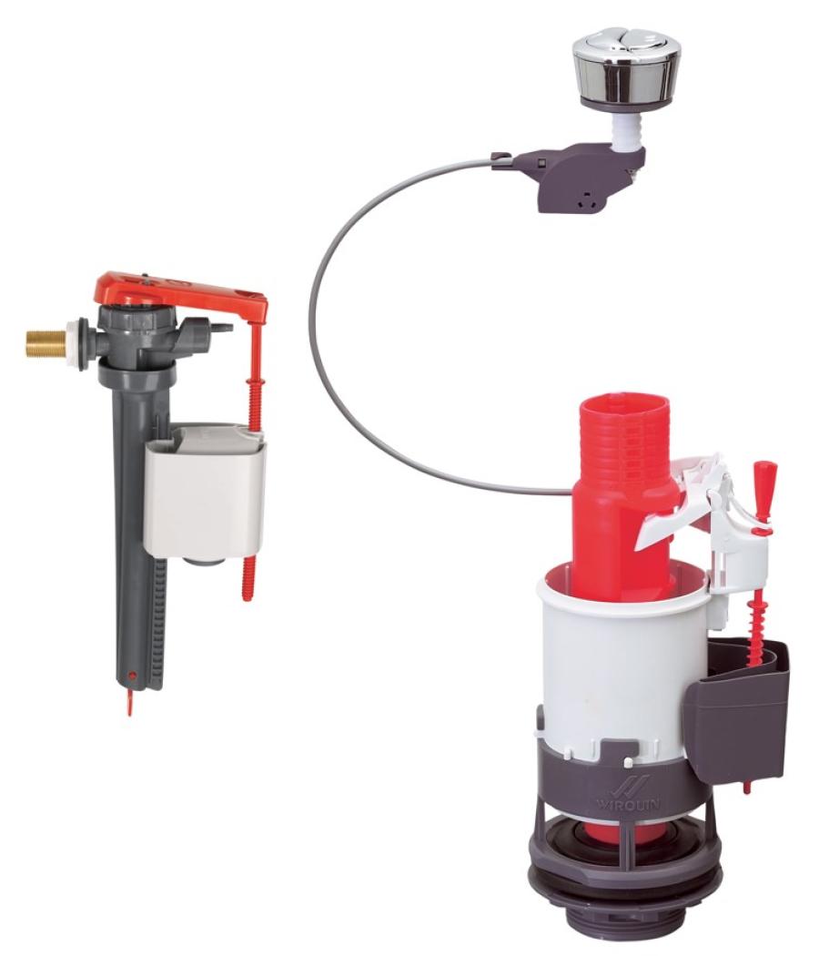 Ensemble complet à double poussoir économie d'eau - Hauteur de réservoir : 300 à 420 mm - Diamètre de trou de couvercle : 14 à 46 mm - Commande du mécanisme : câble - Robinet flotteur : sarvo-valve -Tête rotative (180 °), idéal pour les céramiques étroites (brevet) - Supporte eaux chargées - Très silencieux - Ajustement automatique à la hauteur du réservoir.