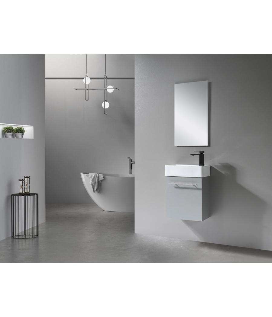 Meuble gain de place, matière hydrofuge, résistant à l'eau. Meuble : 45x25x48 cm Miroir : 42x75 cm. Portes et tiroirs avec système soft-close Coloris : gris. Bonde et robinet non inclus.