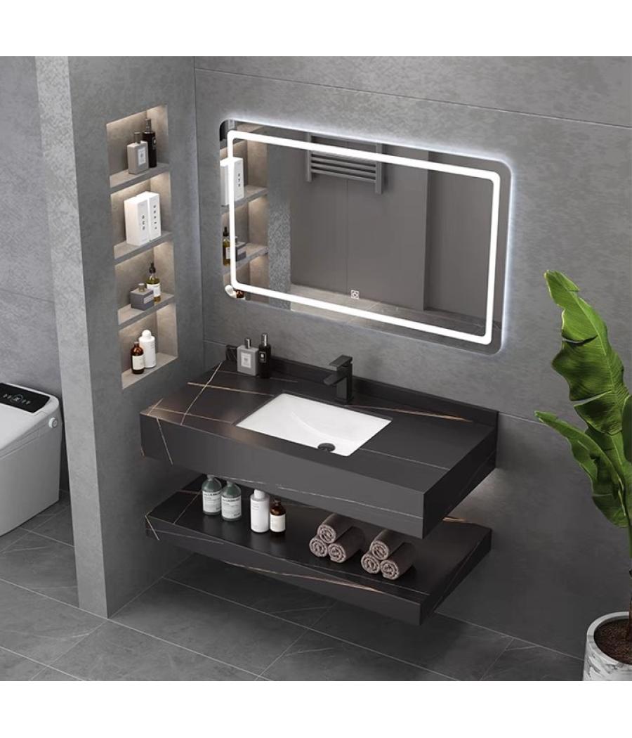 Meuble de salle de bain suspendu, matière hydrofuge, résistant à l'eau. Plan de travail en pierre sintérisée et vasque en céramique blanche encastrée. Meuble : 80x50x15 cm. Etagère : 80x50x8 cm Miroir LED : 80x60 cm Coloris : Noir marbré.