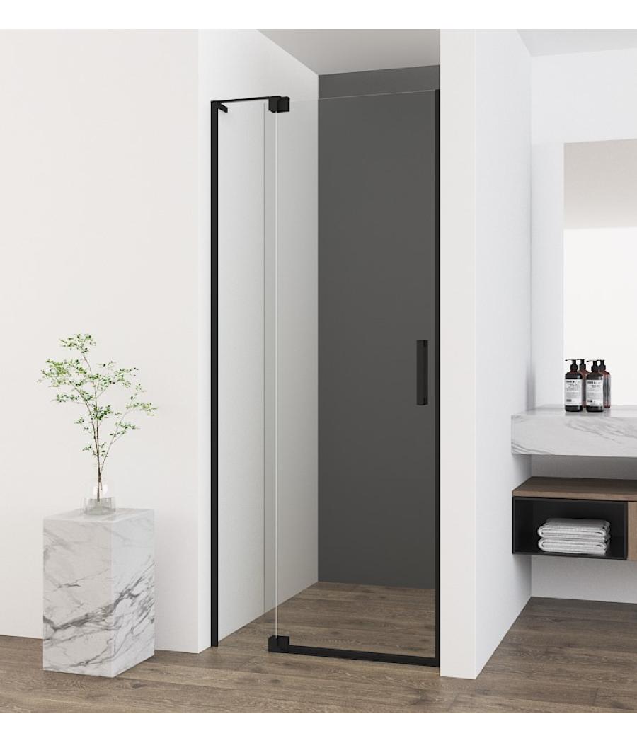 Porte de douche en verre trempé transparent et profilé. Coloris: noir - Système pivotant - Dimensions : 90x195 cm.