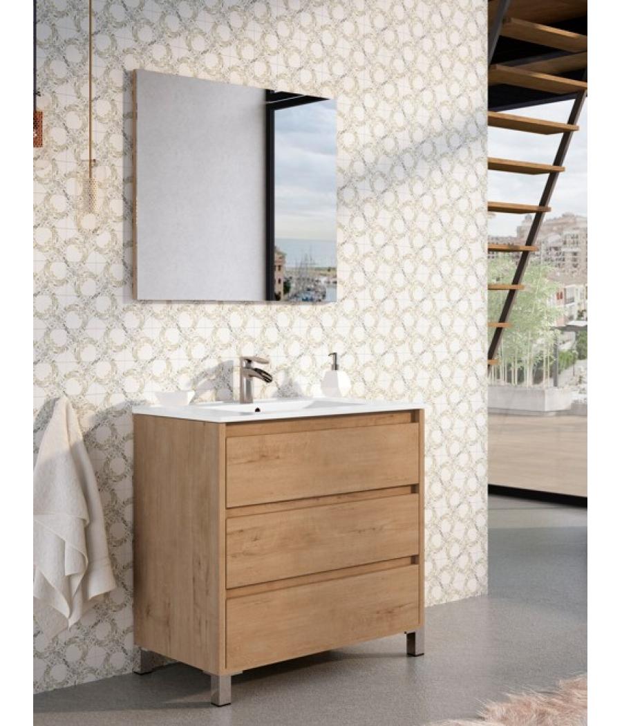 Meuble de salle de bain sur pieds, hydrofuge Meuble : 80x80x46 cm - 3 tiroirs Miroir & vasque fournis Coloris : blanc Bonde et robinet non inclus