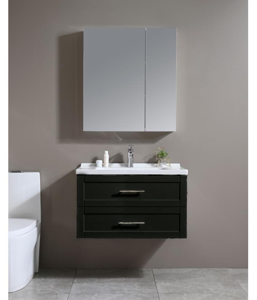 Meuble de salle de bain suspendu, matière hydrofuge, résistant à l'eau. Meuble : 80x46x50cm Miroir avec rangement : 70x80 cm. Portes et tiroirs avec système soft-close. Couleur : noir. Bonde et robinet non inclus.