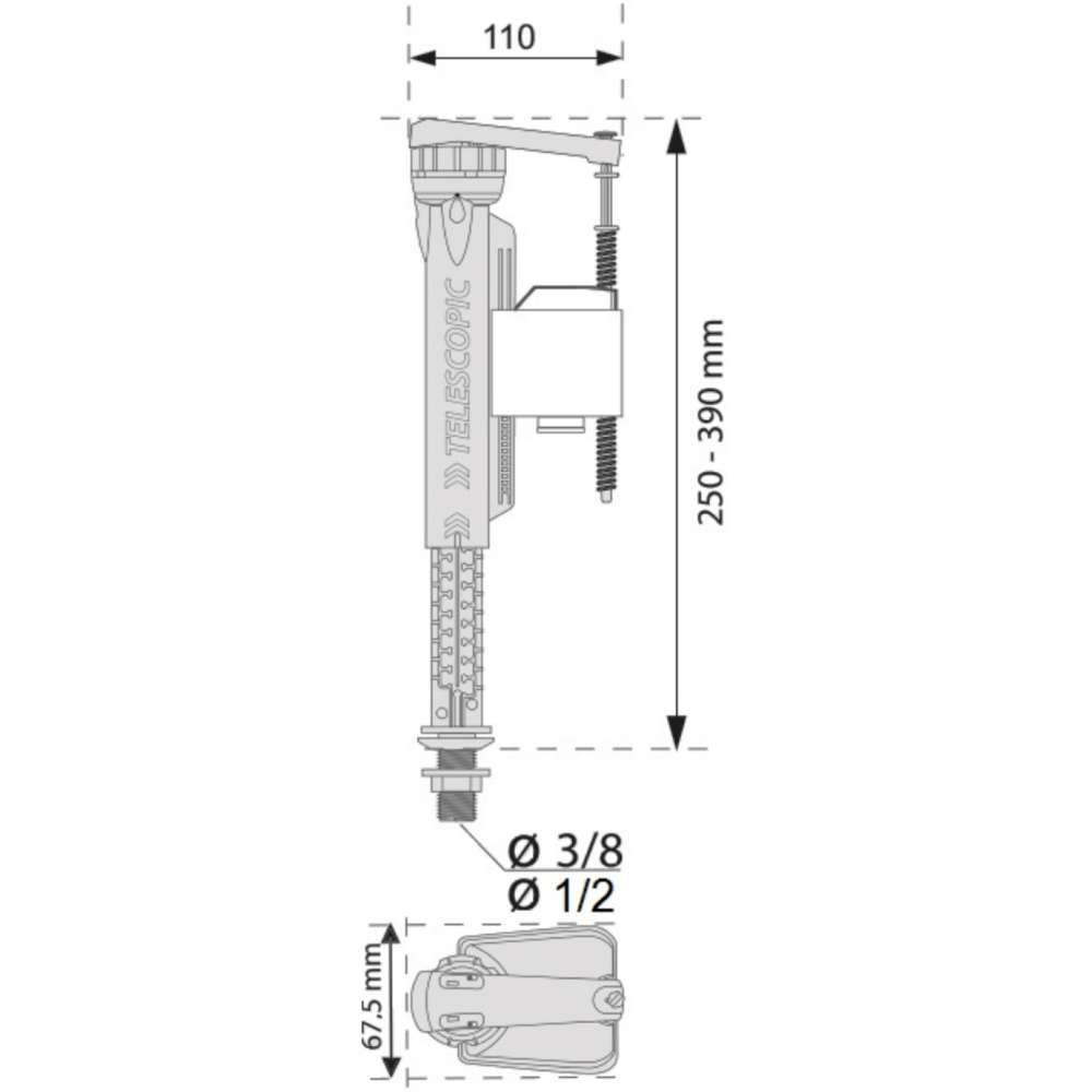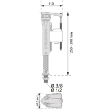 Robinet flotteur à double alimentation - Référence : 5297924 - Marque : Wirquin - Type d'alimentation : Latérale ou basse (double alimentation) - Hauteur réglable : Télescopique, adaptable de 235 à 315 mm - Remplissage : Rapide (6 L en 39 secondes à 3 bar) - Fonctionnalités : Remplissage retardé pour économie d’eau ; Silencieux - Compatibilité pression : Fonctionne à basse et haute pression (0,2 à 1,6 bar), résiste aux pics de pression - Raccord : Laiton 3/8’’ - Dimensions : Hauteur : 22 cm ; Largeur : 10,6 cm - Poids : 300 g - EAN : 3375537221943.