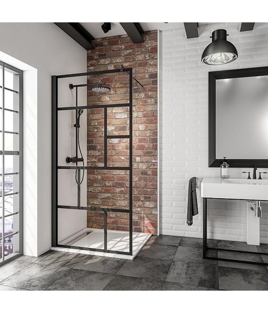 Paroi de douche en verre trempé transparent et profilé noir, avec sérigraphie style industriel - Dimensions : 90x195x0,6 cm