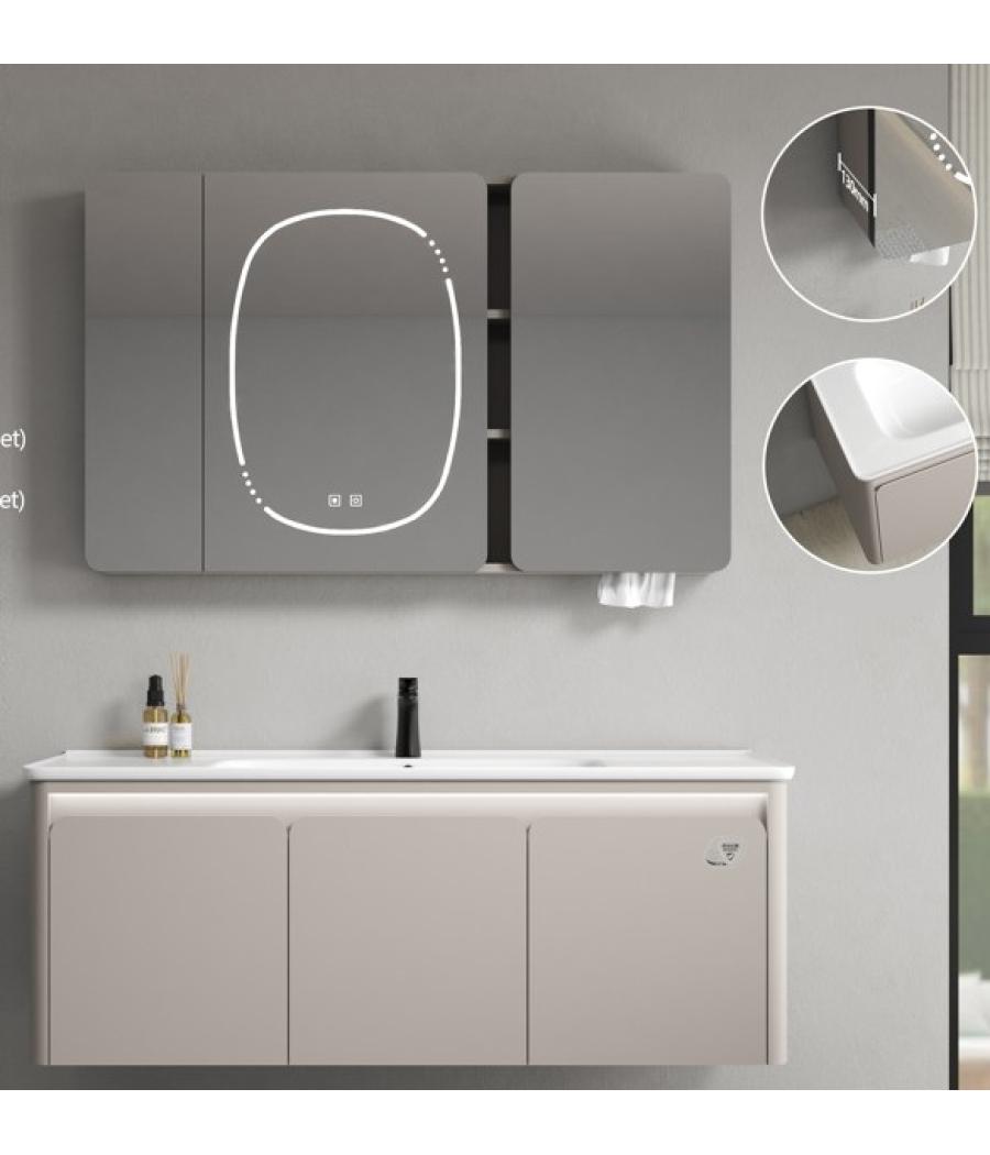 Meuble en métal - 1200x500x480 Miroir LED - 1100x130x680 - avec système de désembuage et rangement Vasque en céramique blanche Coloris : Beige