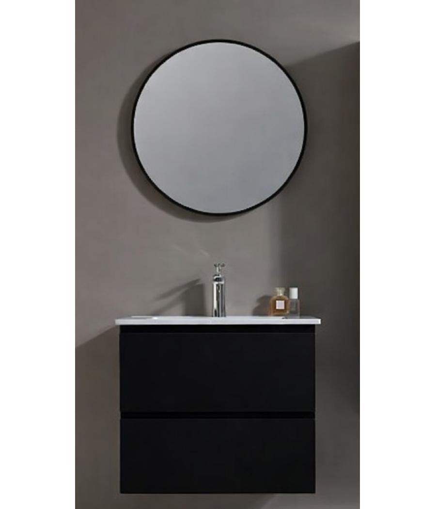 Meuble salle de bain suspendu, matière hydrofuge PVC Meuble : 60x46x50 cm Portes et tiroirs avec système soft-close Couleur : noir Bonde et robinet non inclus