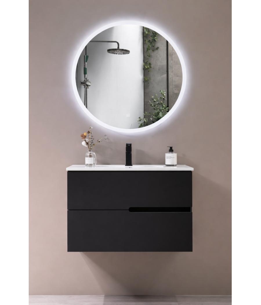 Meuble de salle de bain, matière hydrofuge, résistant à l'eau. Meuble : 79x54x58 cm Miroir LED : 80x80 cm Portes et tiroirs avec système soft-close Coloris : noir Bonde et robinet non inclus