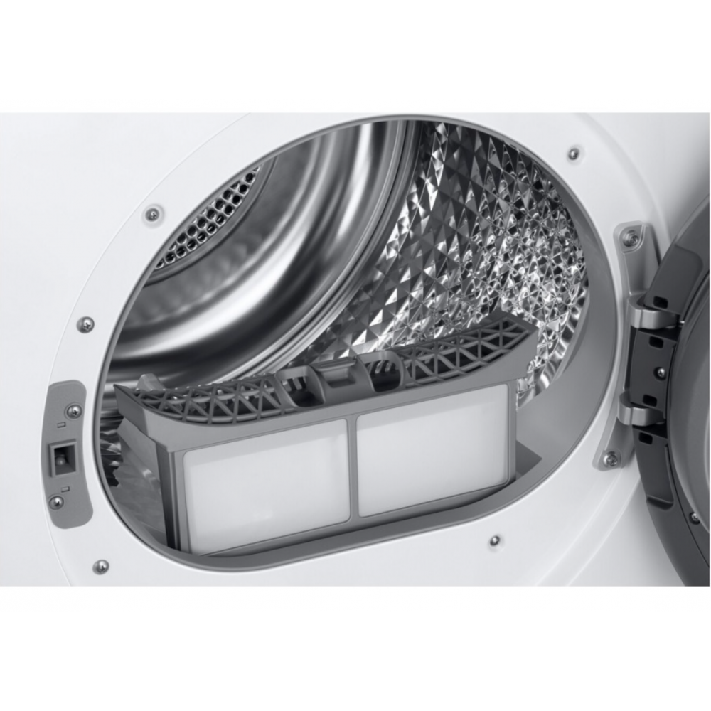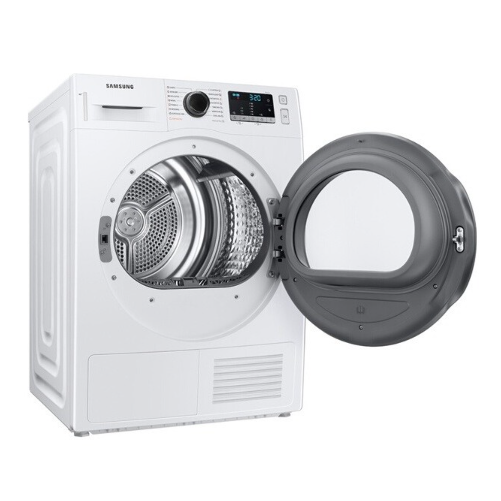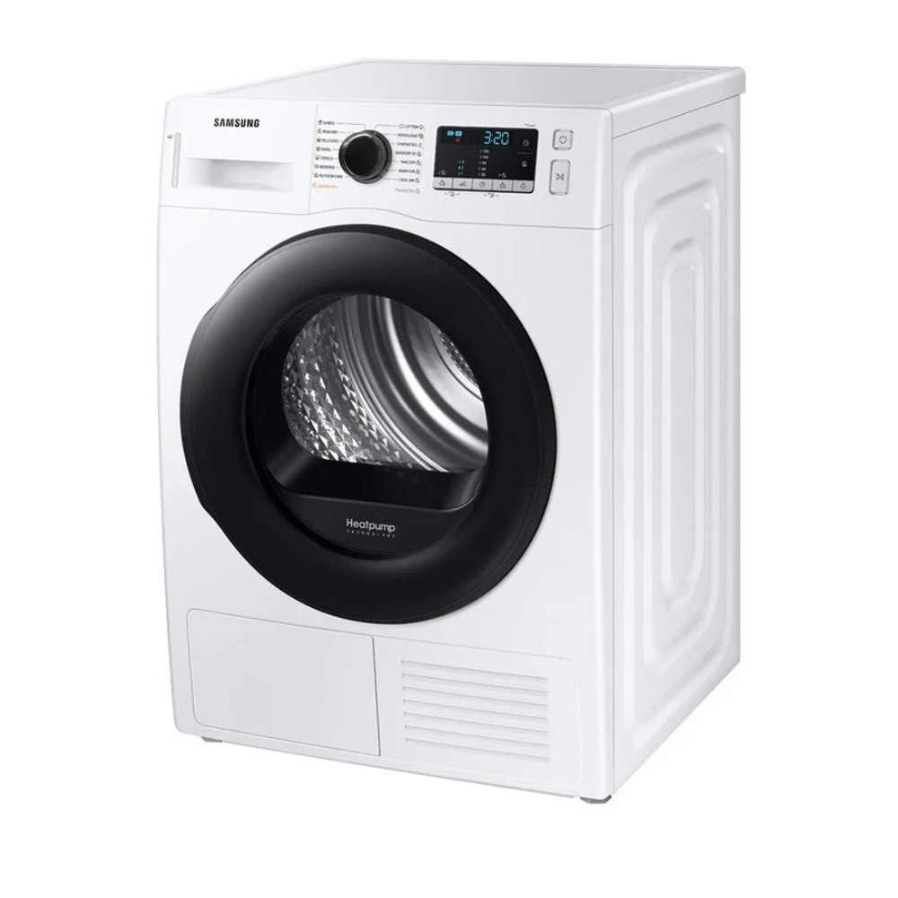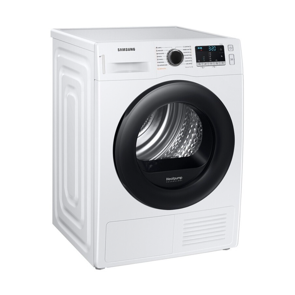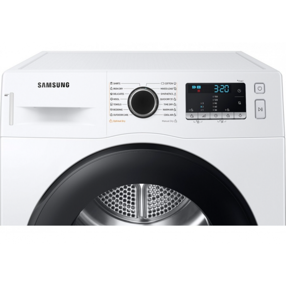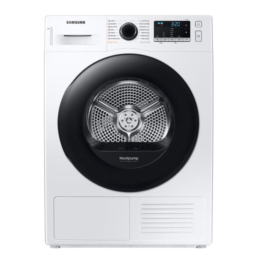 Le sèche-linge  SAMSUNG DV80TA020AE blanc avec contour hublot noir et porte réversible - Capacité 8 kg Technologie Pompe à Chaleur++ - Séchage par sonde (arrêt automatique ) - Fin différée avec affichage du temps restant - Système Optimal Dry & Quick Dry 35' Programme séchage rapide Filtre 2 en 1 - 14 programmes dont un programme de séchage rapide : 1 kg de linge en seulement  35 minutes - Technologie pompe à chaleur pour des économies d'énergie considérable.