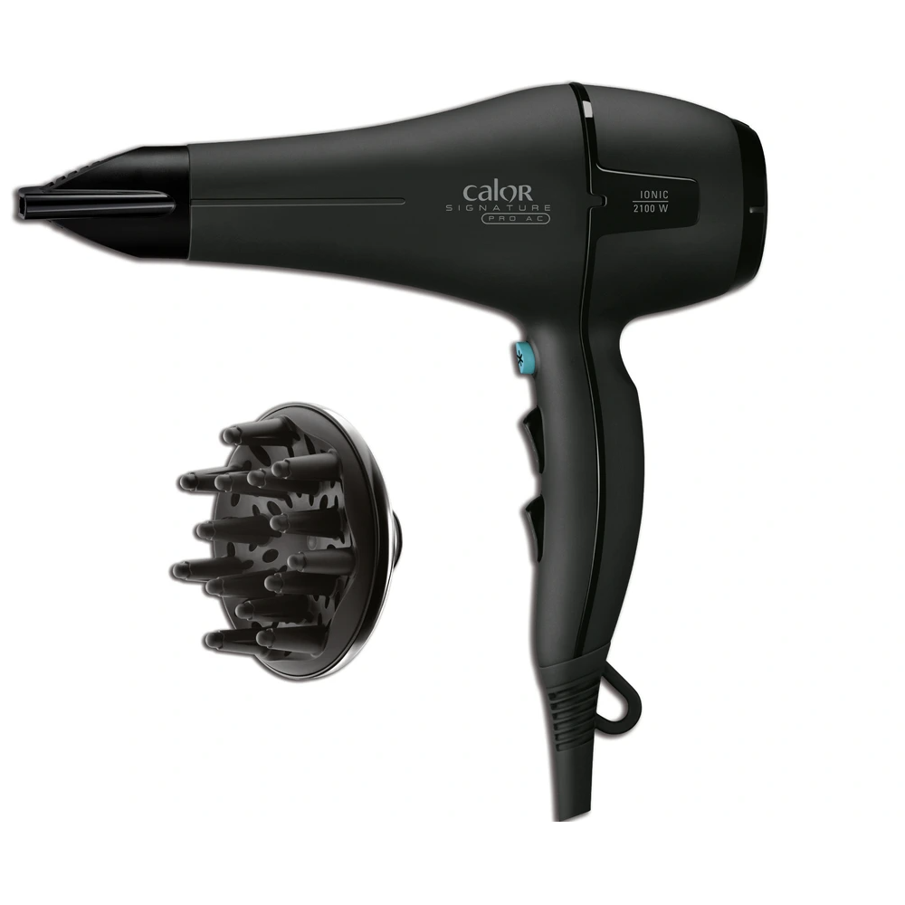 Sèche-cheveux Signature Pro AC Calor - Haute puissance de 2100Watts pour une vitesse de l'air égale à 100km/h - Concentration fin de 6mm - 3 niveaux de température et 2 niveaux de vitesse - Générateur ionique assurer le respect des cheveux - Dispose d'une grille amovible et d'un anneau de suspension ergonomique - Tension entre 220-240volts - Longueur du cordon électrique 1,8m - Brosses et accessoires inclus - Moteur AC.