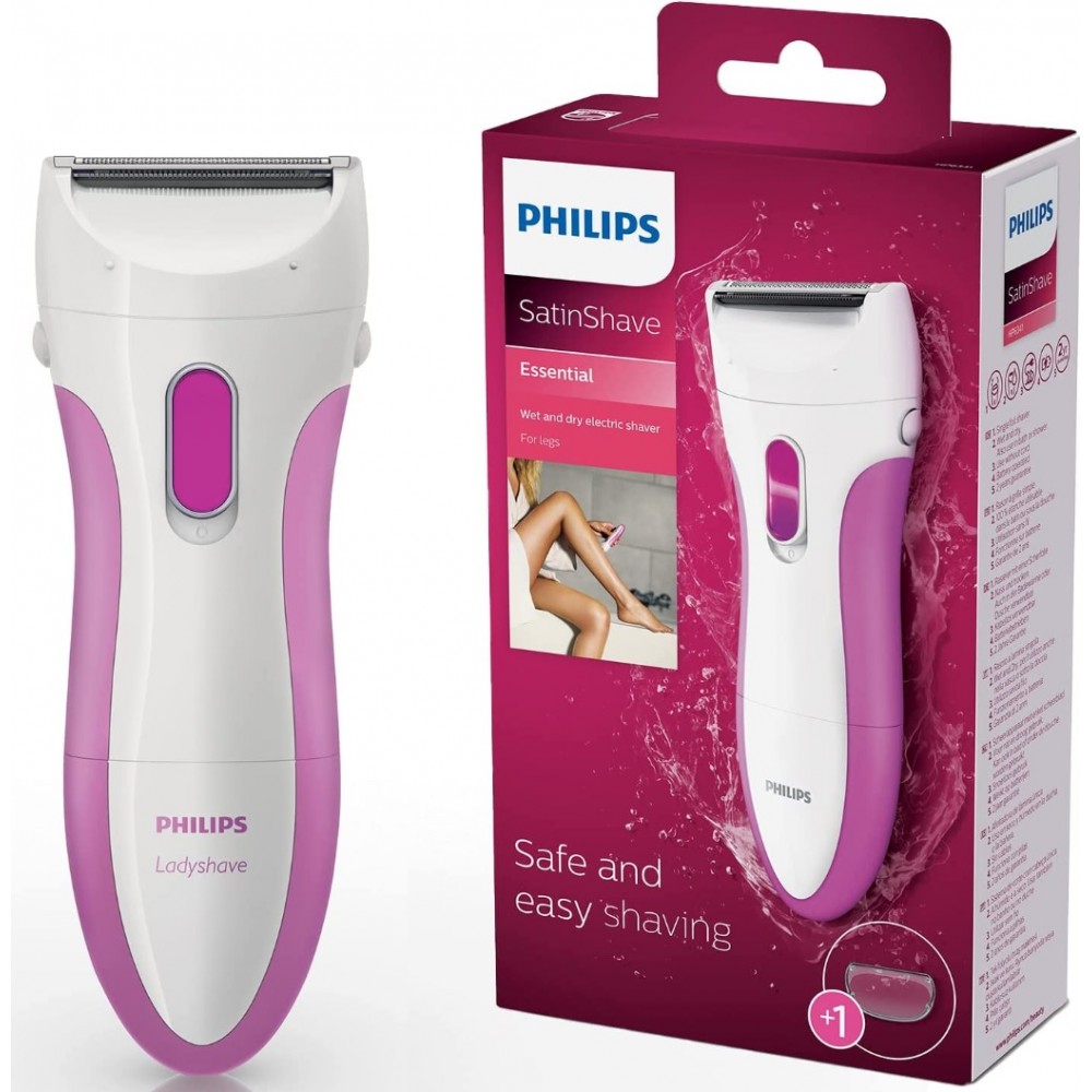 Rasoir éléctrique féminin SatinShave Essential - PHILIPS HP6341/00 - Sous l'eau ou à sec - Rechargeable - Trousse tendance - Coque de protection pour protéger la grille - Design ergonomique ultra-mince - Système de rasage sûr - Alimentation : 2 piles LR06 non fournies