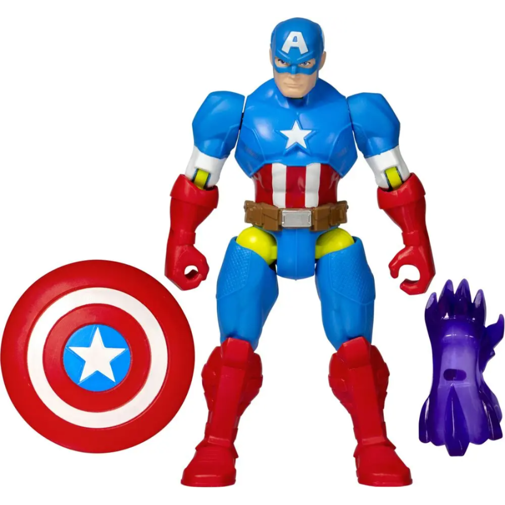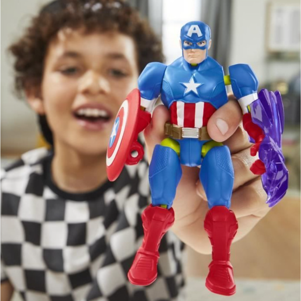 Figurine Avengers du personnage célèbre Captain America - Possède différents points d'articulation et différents points de connexion qui permettent aux enfants de créer un personnage unique en détachant certaines pièces et en combinant ici et là les pièces les unes avec les autres - Très belle idée cadeau pour un fan des super héros du Marvel - Figurine de 10 cm - Comprend une griffe violette ainsi qu'un bouclier - Fait d'un moment de jeu un moment de pure créativité et imagination - Recommandée aux 4 ans et plus.