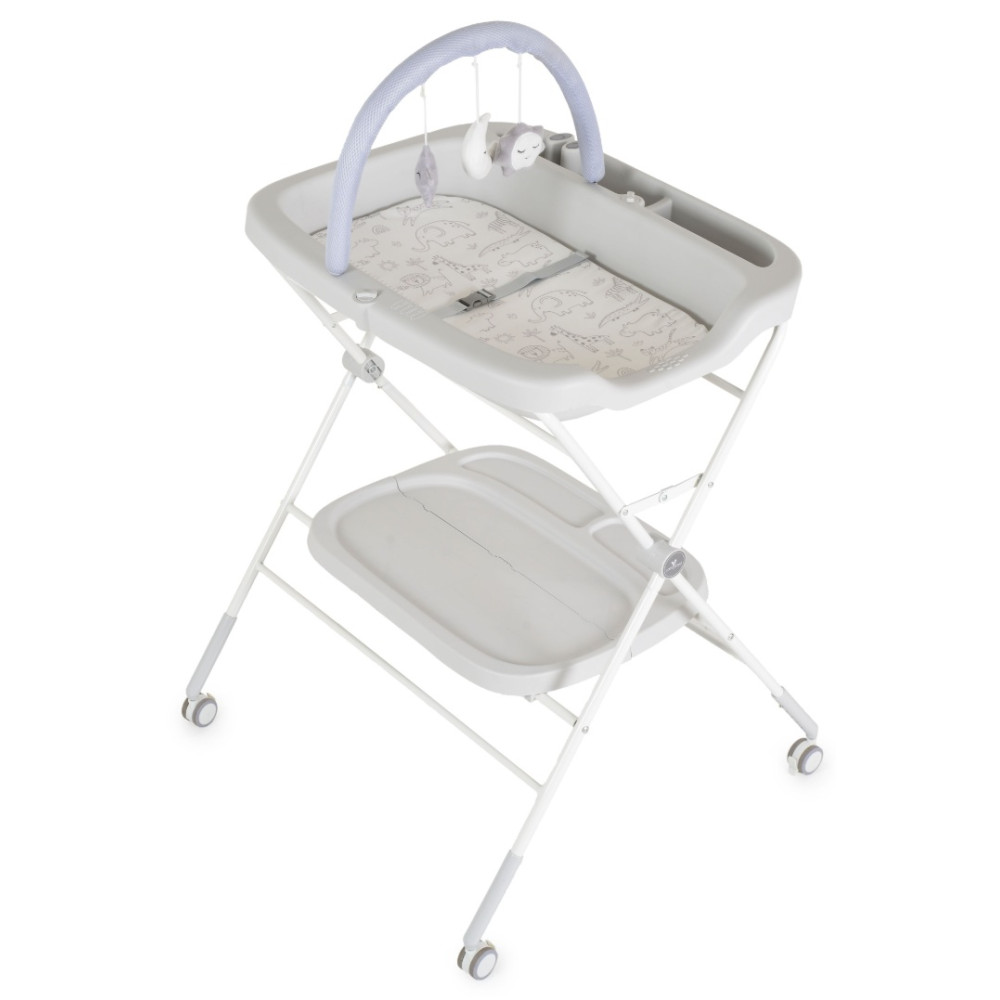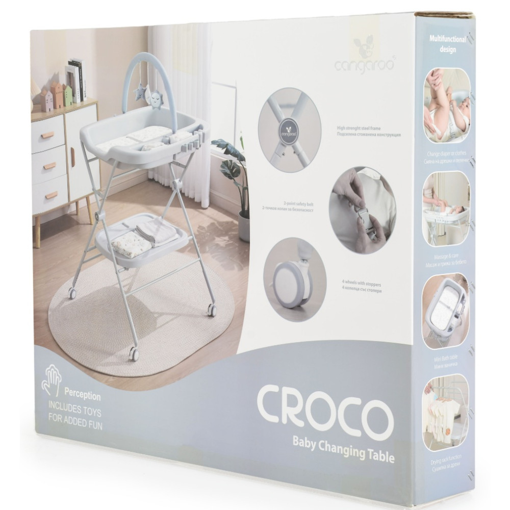 La table à langer multifonctionnelle Croco est idéale pour changer les couches, masser bébé et l'habiller. Réglable en hauteur sur 5 positions, elle offre un confort optimal aux parents. Son système de verrouillage fiable fixe solidement le matelas à langer au cadre, évitant ainsi tout mouvement intempestif. La table comprend un matelas doux gradué, un harnais de sécurité à 2 points, une arche de jeux avec 3 peluches, des compartiments pour les produits d'hygiène et une étagère de rangement. Pliable et équipée de 4 roues avec freins, elle se déplace facilement et se range aisément. Fabriquée à partir de matériaux sûrs et de haute qualité, elle peut également servir d'étendoir. Convient aux bébés de 0 à 12 mois, jusqu'à un poids de 15 kg.