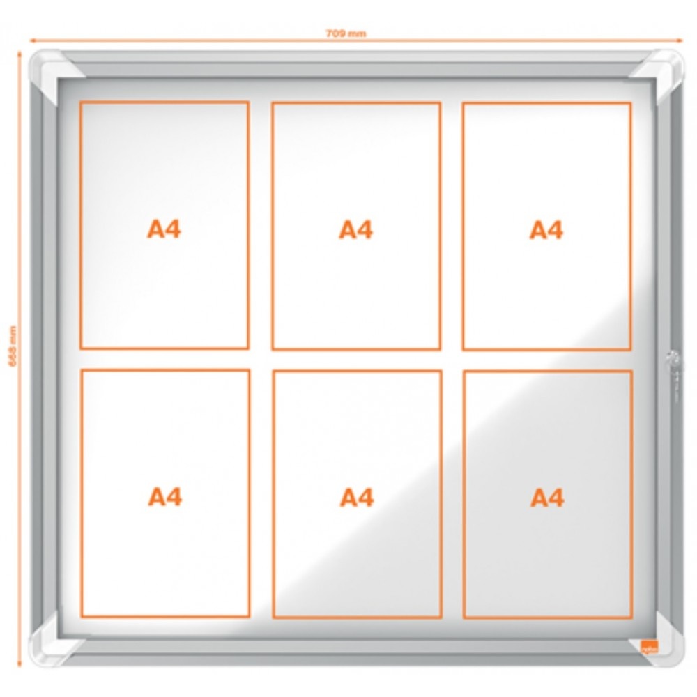 Vitrine d'affichage d'extérieur étanche avec porte battante en verre sécurité et serrure sur le côté. Avec cadre moderne et élégant en aluminium et fixation murale par les coins. Excellente surface magnétique pour afficher vos communications en toute sécurité. Format : 6 feuilles A4. Surface magnétique pour afficher vos communications en toute sécurité. Format : 6 feuilles A4, 709x668mm. Cadre moderne et élégant en aluminium. Montage au mur traditionnel par les coins. Garantie 10 ans.