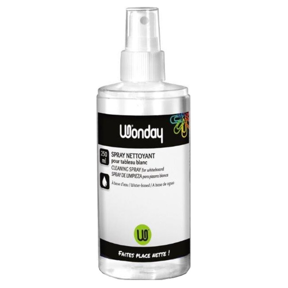 Spray nettoyant pour tableaux blancs. Idéal pour nettoyer les tableaux blancs, plastiques, magnétiques. Sans solvant, ce spray contient 250ml de produit nettoyant à base d'eau.