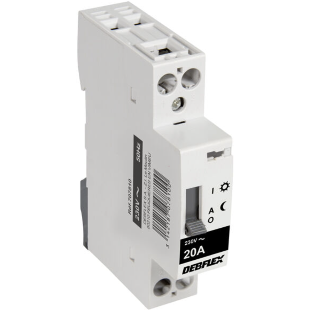 Contacteur jour/nuit DEBFLEX – 20A, 250V, 1 module – blanc/gris - Commande automatique d’éclairage, chauffage ou ventilation - Montage sur rail DIN – bornes à vis (Ø 5 mm, câble max 6 mm²) - Courant assigné : 20A – Tension : 230V – Fréquence : 50Hz - IP20 – fonctionnement de -5°C à +50°C – tenue au feu, UV et chocs (850°C) - Matière bornes : acier zingué – plan de câblage inclus - EAN : 3142187078100.