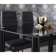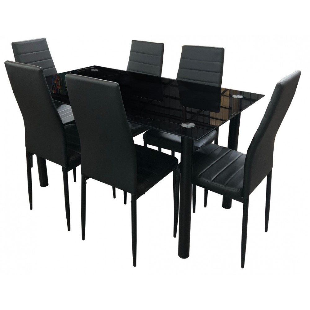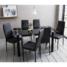 Ensemble table à manger + 6 chaises - plateau en verre trempé noir - pieds PVC noir - Chaise assise et dossier en similicuir noir - pieds métal laqué noir - Dimensions (LwPxH) Table :140x80x75cm - Chaise : 42x43x96cm - Idéal pour vos repas de famille