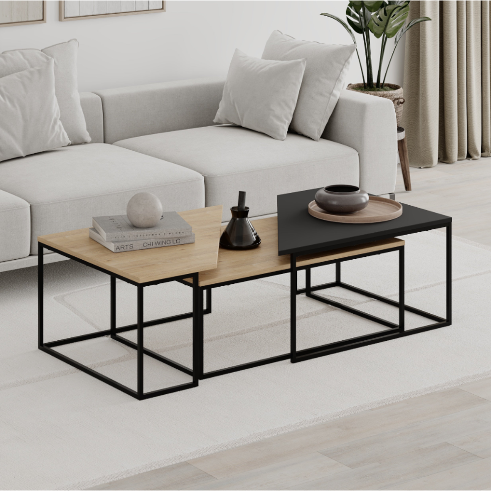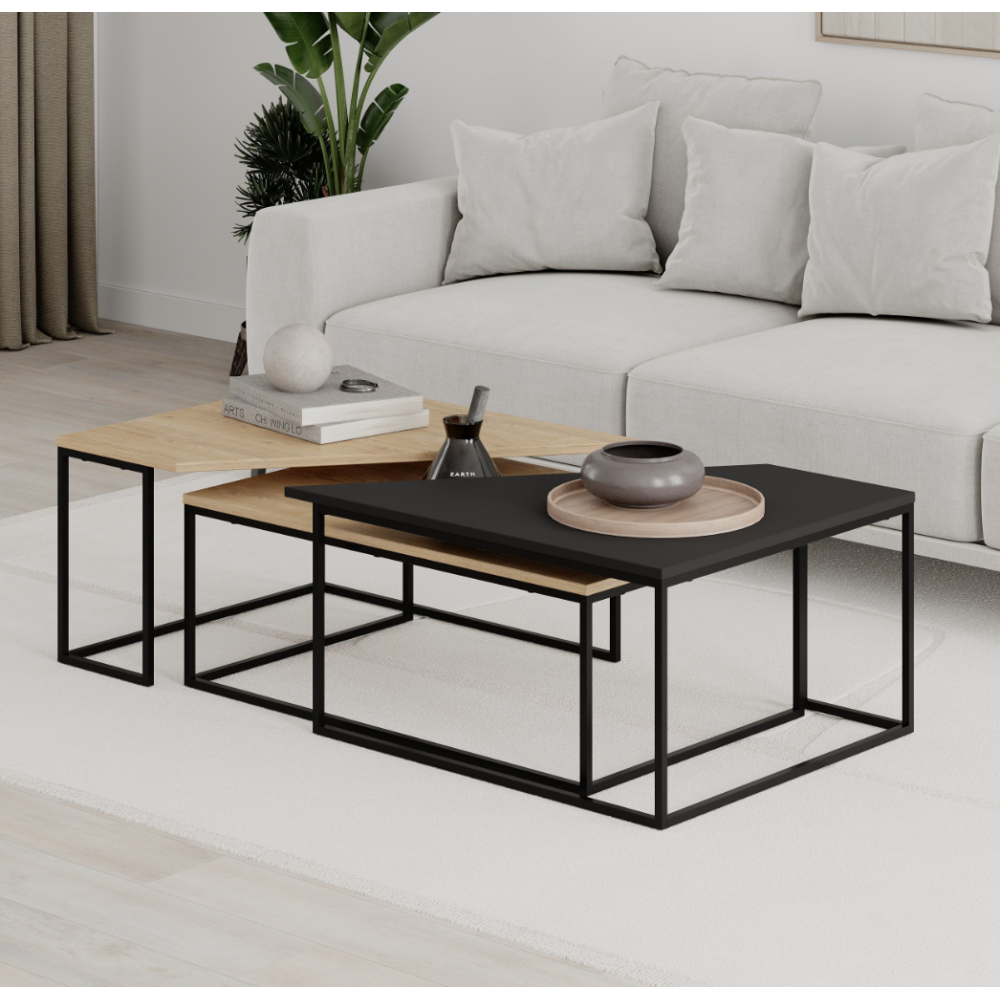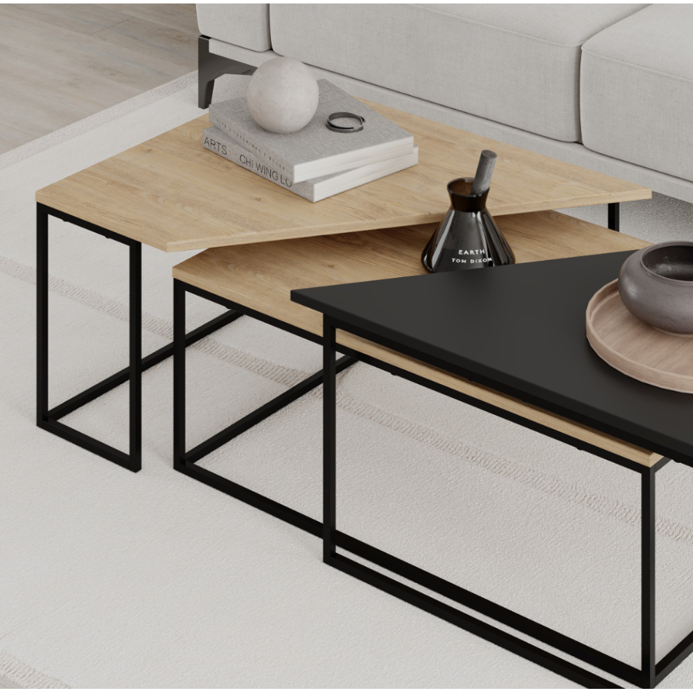 Set de 3 tables basses Titan à usage polyvalent - Composé de 1 table basse rectangulaire et de 2 tables basses de forme trapézoïdale qui se complètent pour former une table basse rectangulaire - Montées sur des pieds rectangulaires en métal - Idéales pour s'intégrer facilement dans un salon ou une chambre.