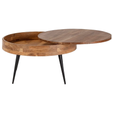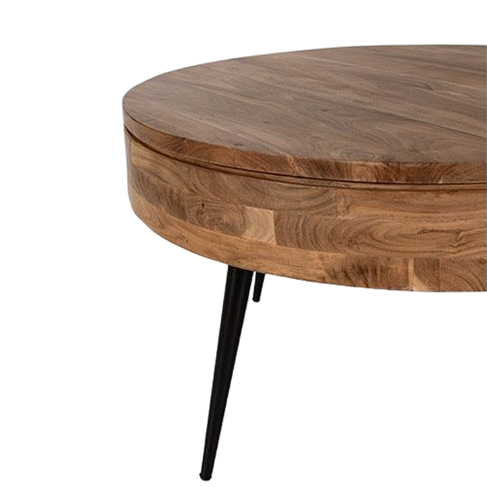 Table basse ronde 16522 avec plateau ouvrant - En bois d'acacia massif et piètement en métal - Le charme du bois massif - Bois traité et tropicalisé - Ligne épurée - Qualité de fabrication - Dimensions : 90x90x50cm.
