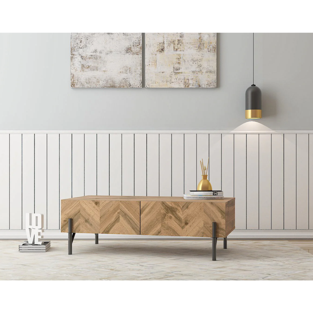Table basse Walton d'une élégance intemporelle pour ajouter à vos pièces de vie une touche chic et sophistiquée - Dotée de 2 portes sans poignée apparente présentant un design régulier avec des motifs en zigzag très originaux - Posée sur 4 supports noirs fabriqués en métal - Affiche un gabarit minimaliste qui convient à toutes les salles de séjour - Dimensions 1600 cm de long, 400 cm de long et 470 cm de haut.
