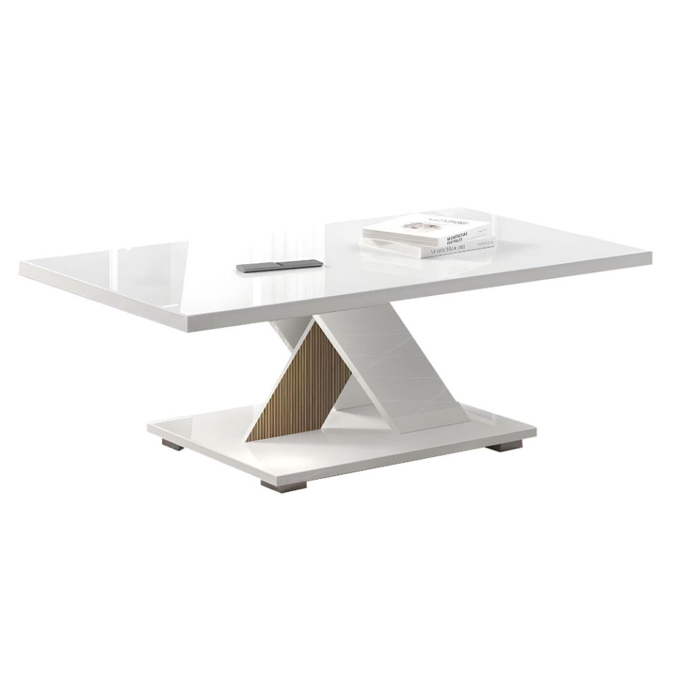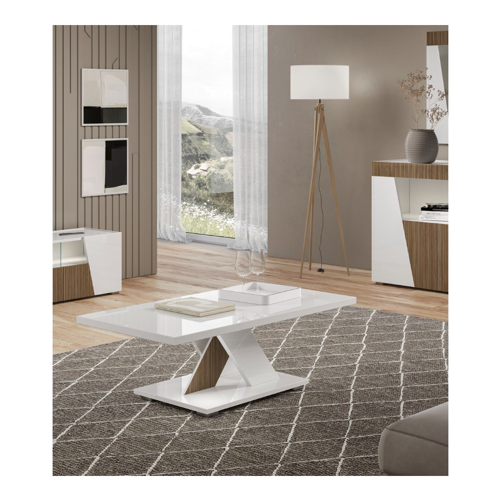 Table Basse Laquée blanc décor bois avec pied central en X - Tendance : elle dispose d'un pied central géométrique au décor tasseaux de bois qui apporte style et originalité - Structure en panneaux de particules écologiques E1 30mm. Pieds plastique H20mm sous la base - Finition : laqué brillant - Dimensions: 120x60 cm.