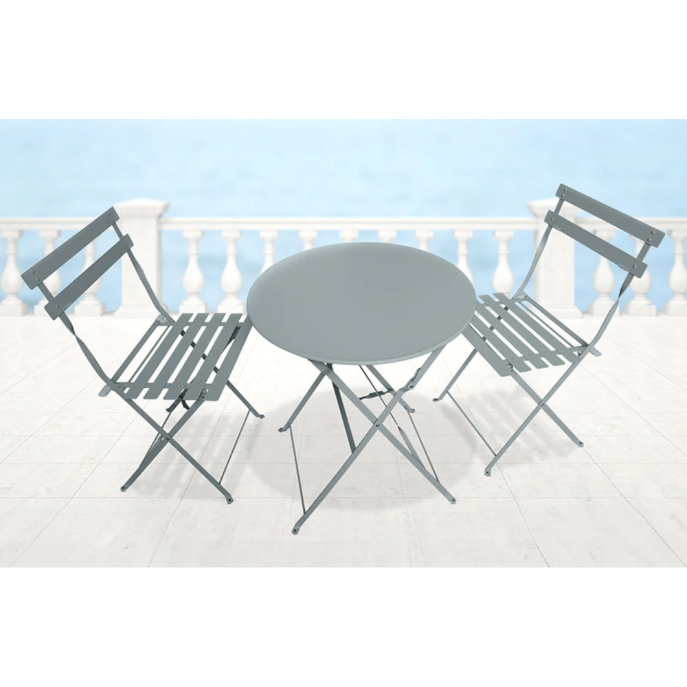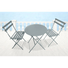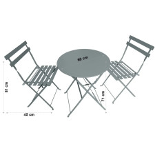 Coloris :- Anthracite : réf. 1069610. Détails dimensions : - Table : Ø 60 x H. 71 cm. - Chaise : 42 x 45 x 81 cm. Charge max. 140 kg / chaise. Non inoxydable : pensez à protéger votre mini salon de la pluie et de l'humidité. Table et chaises pliables.