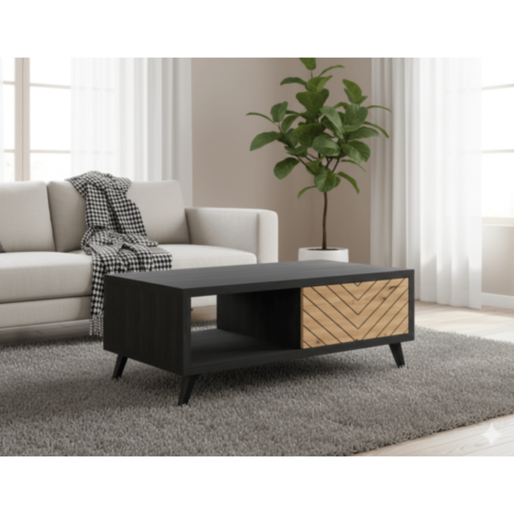Table basse Athena conçue avec un design à la fois sobre et élégant - Doté d’un grand tiroir creux et d’un espace ouvert pour disposer des objets décoratifs au choix - Constitué d’une plateforme de 104 cm de long et d’un piétement de 4 pattes moyennes - Arbore un coloris noir avec des parties en bois clair ainsi que des motifs en lambris - A installer dans une salle de séjour pour compléter un salon d’angle - Mesure 68 cm de haut et 42 cm de profondeur.