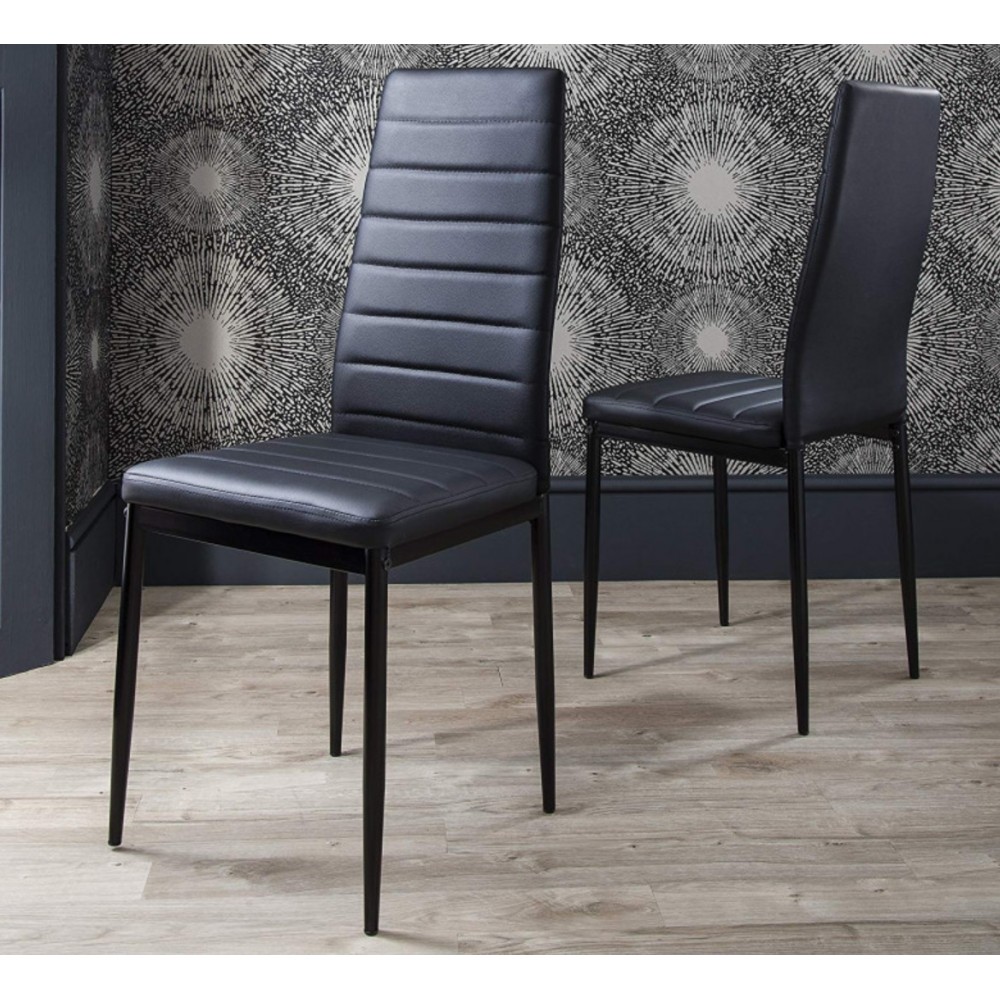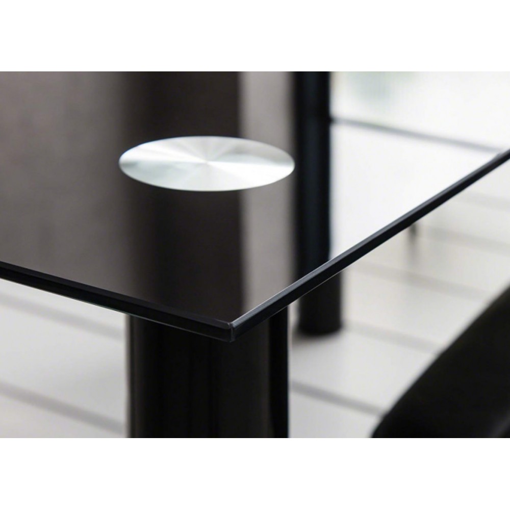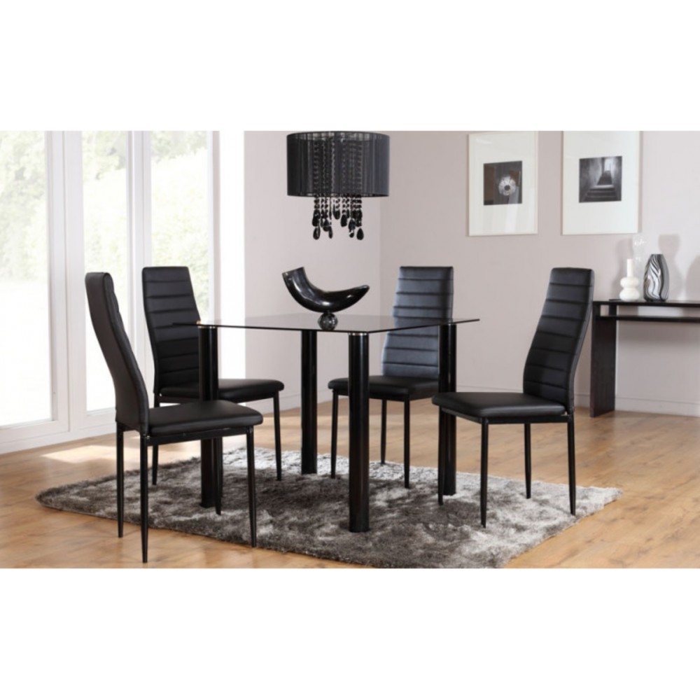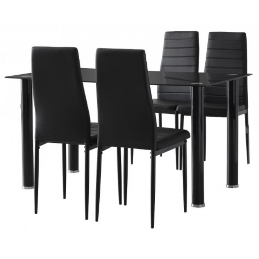 Ensemble table à manger + 4 chaises - plateau en verre trempé noir - pieds PVC noir - Chaise assise et dossier en similicuir noir - pieds métal laqué noir - Dimensions (LwPxH) Table :120x70x75cm - Chaise : 42x52x96cm - Idéal pour vos repas de famille