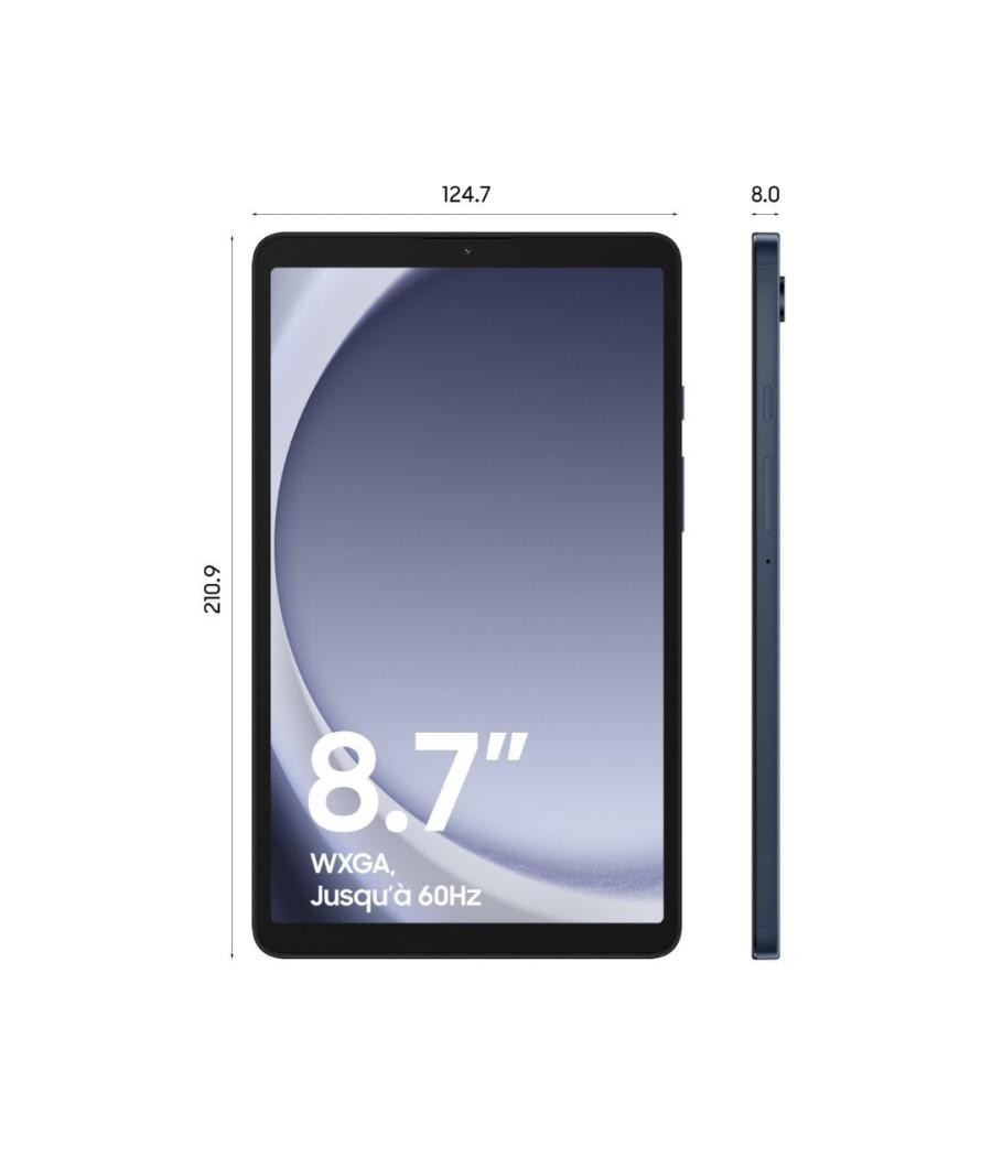 Tablette Samsung Galaxy Tab A9+ SM-X210NDBAEUB - Couleur : Bleu marine - Système d'exploitation : Android 13 - Stockage : 64 Go (extensible via microSD jusqu'à 1 To) - Processeur : Qualcomm Snapdragon 695, Octa-core - RAM : 4 Go - Écran : 11"(27,9 cm) LCD IPS, 1920 x 1200p, 90 Hz, 224 ppi - Audio : Dolby Atmos, 4 haut-parleurs - Connectivité : WiFi 802.11 ac, Bluetooth 5.1, USB Type-C - Caméras : Arrière : 8 MP ; Frontale : 8 MP - Autonomie : Jusqu'à 10 heures - Batterie : 7040 mAh (Li-Ion) - Dimensions : 168.7 x 257.1 x 6.9 mm - Poids : 480 g.