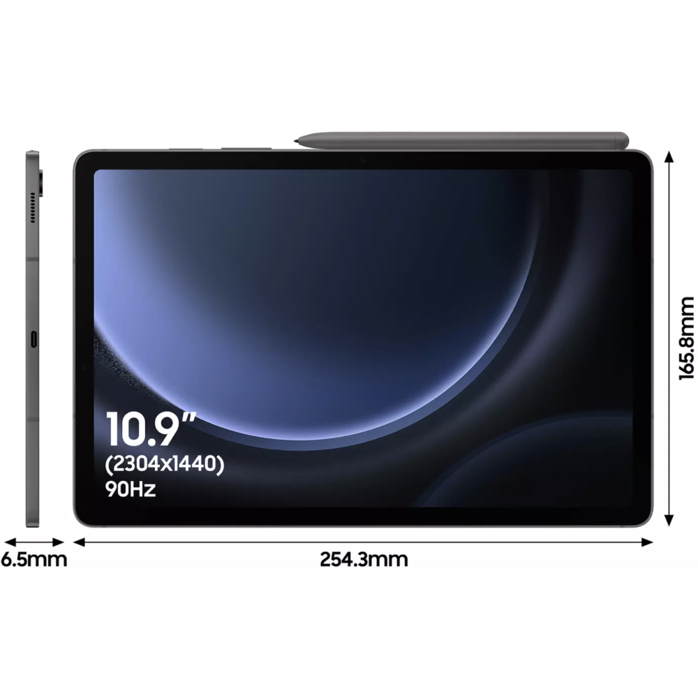 Tablette Samsung Galaxy Tab S9 FE SM-X510NZAAEUB - Couleur : Anthracite - Système d'exploitation : Android 13 - Écran : 10.9" TFT LCD, résolution 2K (2304 x 1440p), 249 ppi, 90 Hz - Processeur : Samsung Exynos 1380, Octa-core (2 GHz / 2.4 GHz) - RAM : 6 Go - Stockage : 128 Go UFS, extensible via microSD (jusqu'à 1 To) - Caméra arrière : 8 MP - Caméra avant : 12 MP - Connectivité : Wi-Fi 6, Bluetooth 5.2, USB Type-C - Autonomie : Jusqu'à 18 heures, batterie 8000 mAh (Lithium-ion) 2 cellules - Dimensions : 165.8 x 254.3 x 6.5 mm - Poids : 523 g.