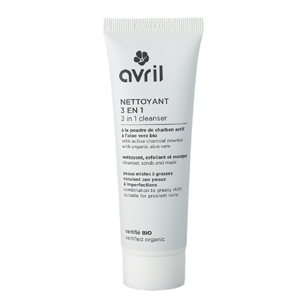 Nettoyant visage 3 en 1 bio Avril de contenance 50ml: nettoie, exfolie et masque - Enrichi en poudre de charbon actif, en argile blanche et en aloe vera bio qui assainit la peau sans l'agresser - Produit une peau douce, nette et éclatante de beauté - Convient aux peaux à imperfections. Ingrédients: Kaolin, aqua, aloe barbadensis leaf juice, glycerin, propanediol, charcoal powder, microcrystalline cellulose, decyl glucoside, prunus armeniaca seed powder, volcanic sand, zea mays starch, zinc pca, rhamnose, glucose, glucuronic acid, xanthan gum, sclerotium gum, cellulose gum, ammonium c12-16 alkyl sulfate, sodium citrate, sodium phytate, alcohol, dehydroacetic acid, benzoic acid, parfum, benzyl alcohol, linalool, citronellol, geraniol.