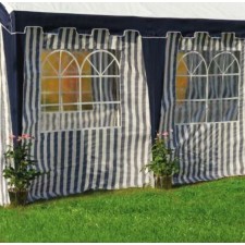 Ce mur est équipé d'une porte et permet de fermer élégamment votre chapiteau de réception. Convient aux chapiteaux de réception 3 x 6 m et 3 x 10 m. Dimensions : l. 3 x h. 2,80 m. Dimensions porte : l. 1,15 x h. 1,90 m. Espace entre les rayures : 5 cm. Matière : polyéthylène. Poids : 750 g environ. Coloris : blanc et bleu. Fixation du mur à l'aide de 4 scratchs autour des barres de la structure. Système de 3 lacets pour bloquer la porte ouverte.