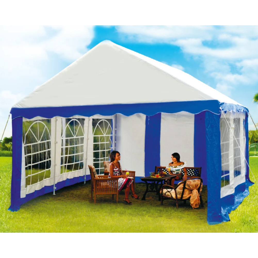 Pour toutes vos réceptions ce chapiteau de grandes dimensions s'adapte à toutes les situations (mariage, baptêmes, etc) - Livré avec ses 4 murs - En version ouvert ou fermé, il préserve la tranquillité de vos repas - Doté d'une toile imperméable - Structure en métal et toile en polyéthylène - Coloris blanc et bleu.