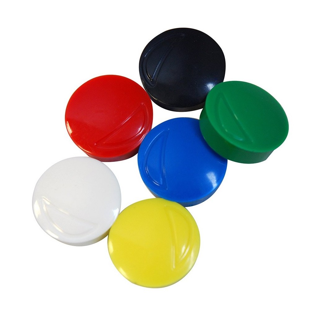 Boite de 6 aimants 20mm. Aimants en ferrite avec coiffe plastique, coloris assortis (bleu, rouge, vert, jaune, noir, blanc). Ces aimants peuvent aimanter jusqu'à 10 feuilles simultanément.