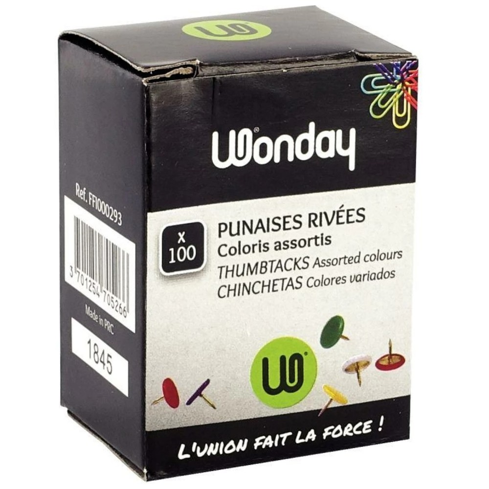 La boite de 100 punaises épingles Pointe acier tête plastique de la marque WONDAY est un ensemble d'épingles signalétiques polyvalentes, parfait pour une utilisation à la maison ou au bureau. La boite comprend 100 épingles signalétiques de couleurs assorties avec des pointes en acier et des têtes en plastique. Ces épingles signalétiques sont faciles à employer et permettent de fixer des documents, des notes, des cartes, des photos et bien plus encore sur des tableaux d'affichage, des panneaux, des murs et d'autres surfaces. Elles sont pratiques pour organiser des informations ou pour décorer des espaces de travail ou des espaces de vie. Les pointes en acier sont robustes et résistantes, permettant une fixation solide et durable...