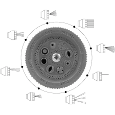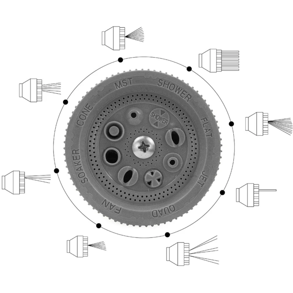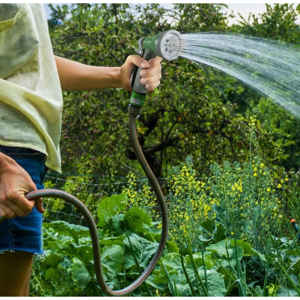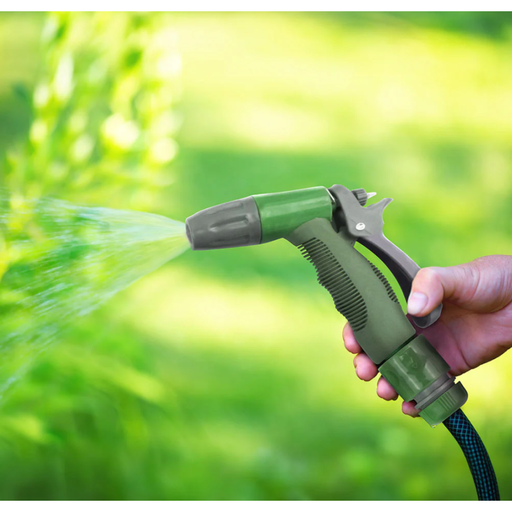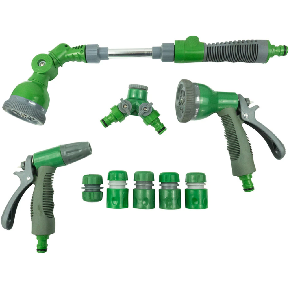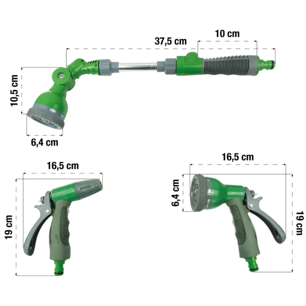 Kit d’arrosage constitué de 2 pistolets d’arrosage disposant respectivement de 8 jets avec gâchette et d’un pulvérisateur à gâchette - Inclus 1 raccord Y, 1 raccord de jonction, 2 raccords rapide stop et 2 raccords rapide - Embarque une lance d’arrosage d’une longueur de 46,5 cm et un diamètre de 6,5 cm dotée d’une tête orientable haut/bas d’une poignée ergonomique et d’un bouton marche/arrêt.