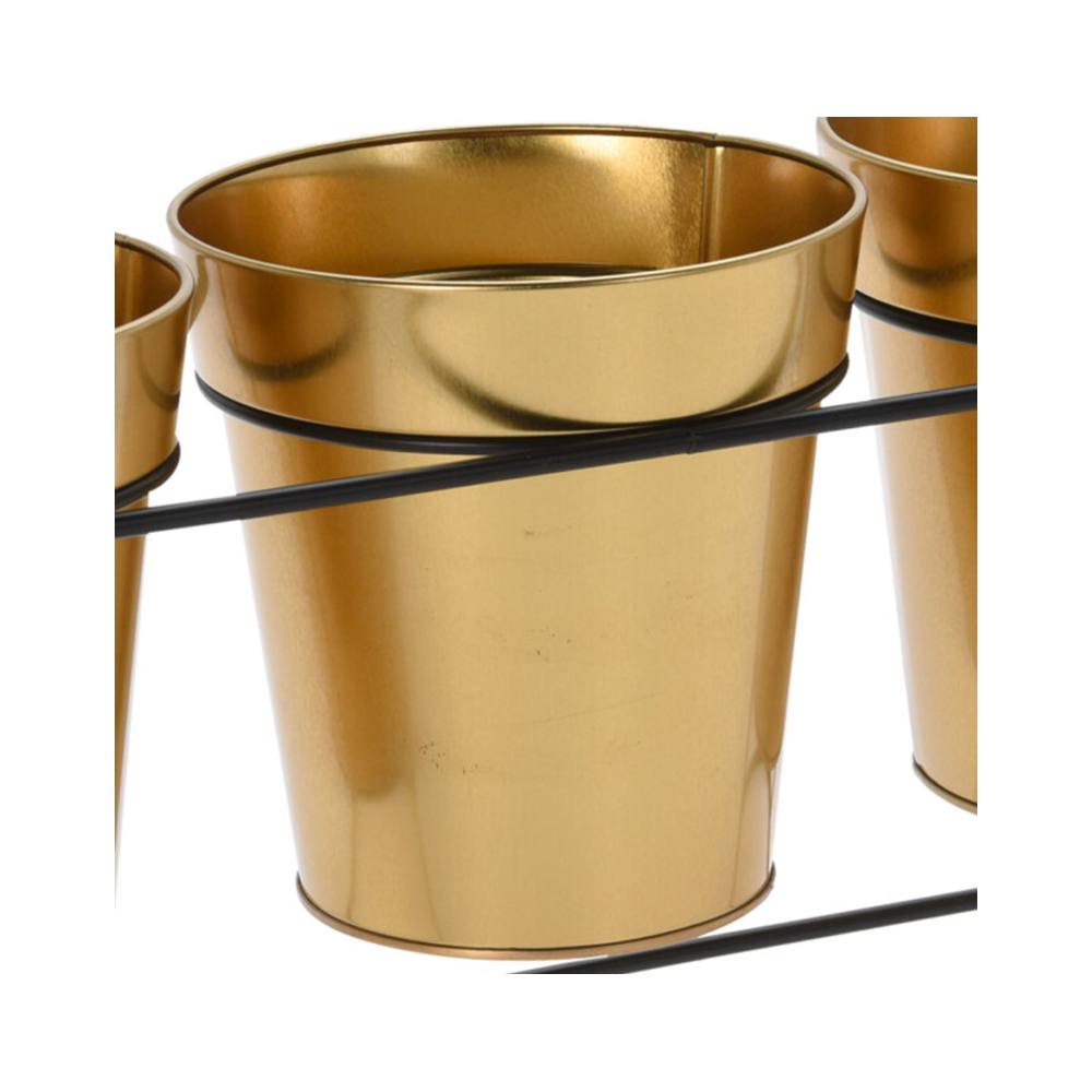 Set composé de 3 pots dorés et d'un support en métal noir - Apporte une touche déco et met en valeur vos plantes - Dimensions: 44.5x14x23.5cm (dimensions pots: 14x14x14cm) - Couleur: Doré et noir - Matière: Métal.