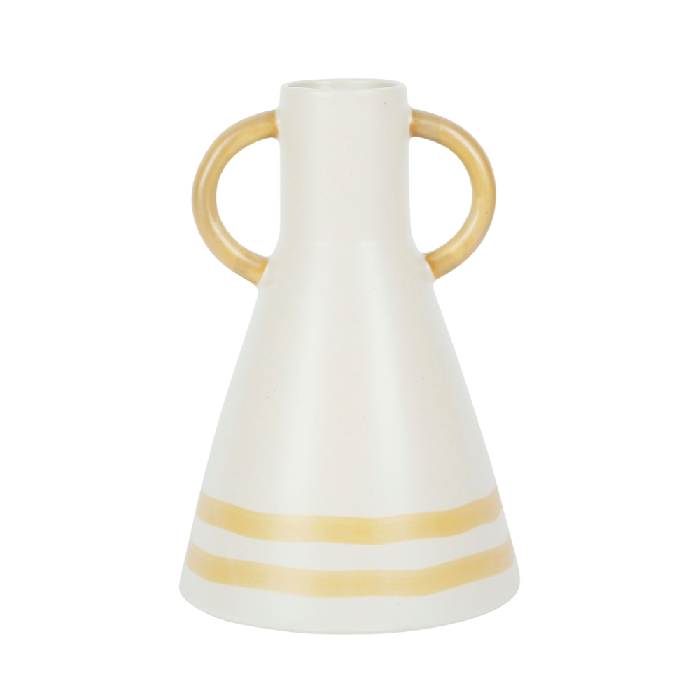 Le vase Exaltation séduit par son design délicat et sa finition blanc cassé qui inspire la douceur et la sérénité. Fabriqué en céramique émaillée, il allie élégance et authenticité. Sa silhouette conique et ses deux anses arrondies lui confèrent un charme artisanal revisité, idéal pour une décoration contemporaine ou bohème. Les fines bandes dorées peintes à la main apportent une touche lumineuse et raffinée. Parfait pour sublimer un bouquet sec ou comme objet décoratif à part entière. Dimensions : D15 x H22 cm.