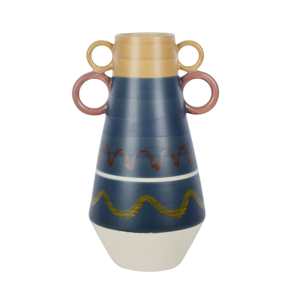 Apportez une touche d’audace et d’élégance à votre intérieur avec le Vase Exaltation D17xH28cm. Ce vase en céramique séduit par son design moderne et sa palette de couleurs harmonieuse : un bleu profond dominant, rehaussé d’un col beige sable, d’une base blanc cassé et d’anses rose terre cuite. Les motifs ondulés peints à la main en marron rougeâtre et jaune doré ajoutent une note artistique et vibrante. Original et raffiné, il s’impose comme une pièce décorative forte, parfaite pour accueillir vos fleurs ou orner votre espace avec style.
