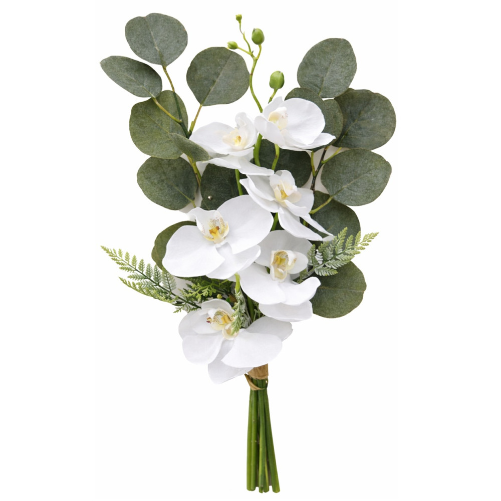 Bouquet artificiel d’orchidées blanches de 45cm. Apportez une touche de fraîcheur et d’élégance à votre décoration avec ce bouquet artificiel d’orchidées blanches au rendu très réaliste. Les fleurs délicates aux pétales soyeux et cœur subtilement teinté sont harmonieusement associées à des feuilles d’eucalyptus et de fines touches de verdure, pour un effet naturel et raffiné. Idéal pour sublimer un intérieur, un bureau, une vitrine ou un événement, ce bouquet décoratif s’intègre facilement à tous les styles de décoration. Sans entretien, il conserve toute sa beauté au fil du temps