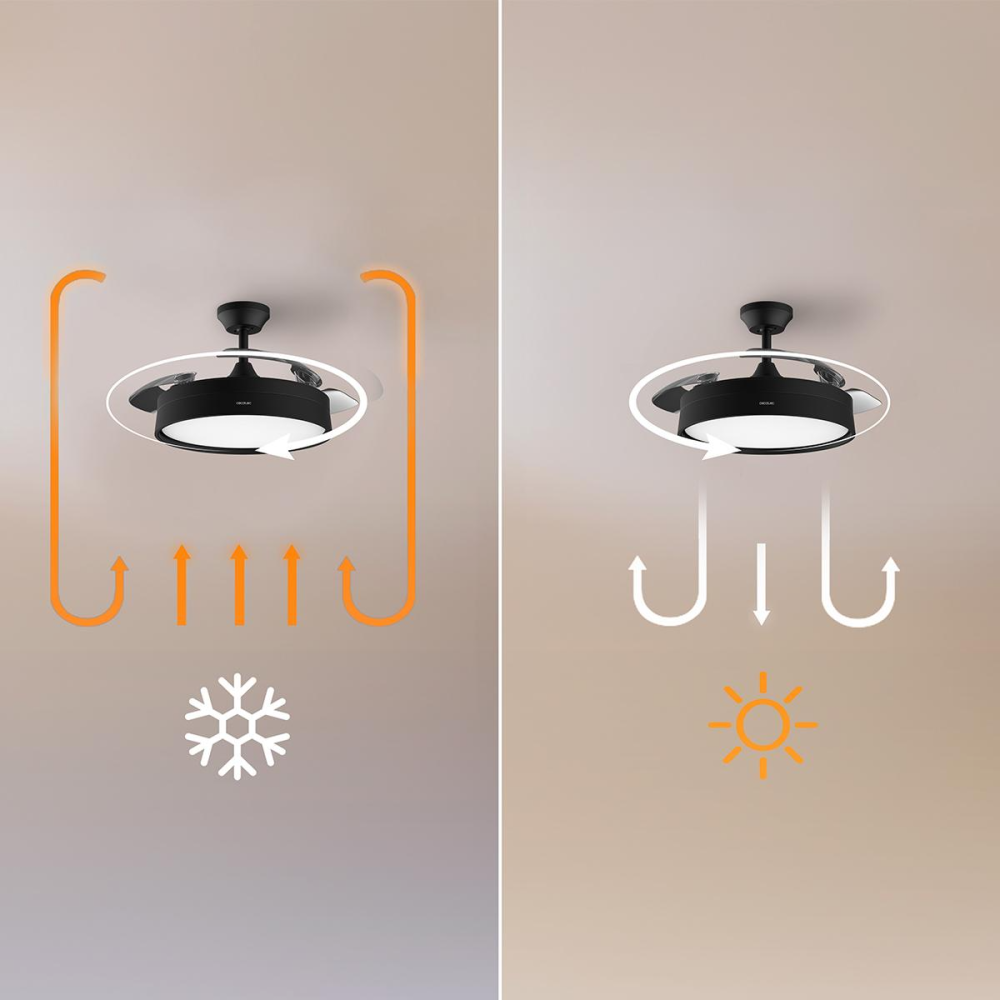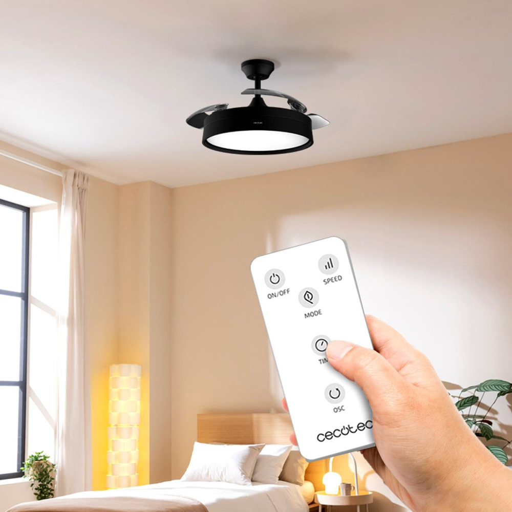 Energysilence Aero 4200 Invisible Black est un ventilateur de plafond au design élégant, idéal pour rafraîchir et éclairer avec discrétion. Ses 3 pales rétractables disparaissent quand la lumière seule est allumée, offrant un look minimaliste en noir. Son moteur DC de 30 W assure une ventilation silencieuse et efficace avec 6 vitesses pour s’adapter à chaque moment. Il intègre une lampe LED pour un éclairage pratique, une minuterie réglable jusqu’à 8 heures et la fonction été/hiver pour inverser le flux d’air selon la saison. La télécommande fournie permet un contrôle simple et confortable à distance. Parfait pour le salon, la chambre ou le bureau, il favorise une circulation d’air homogène.