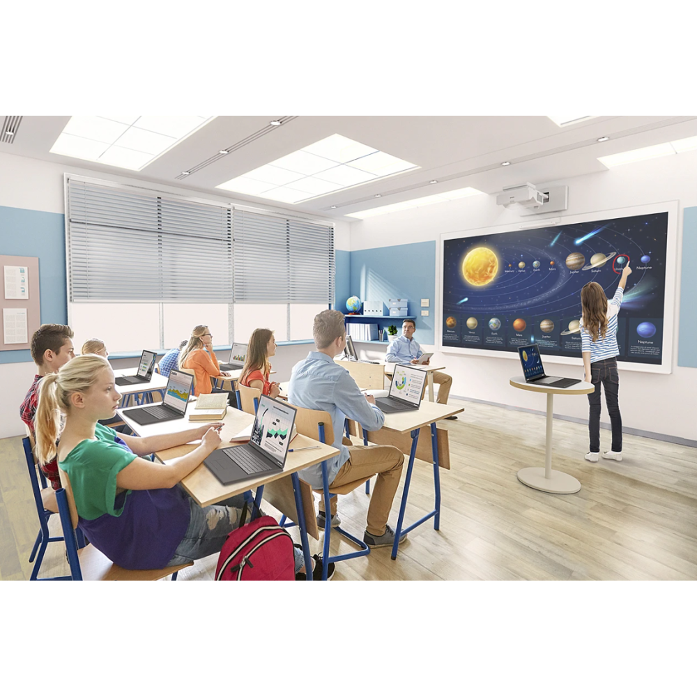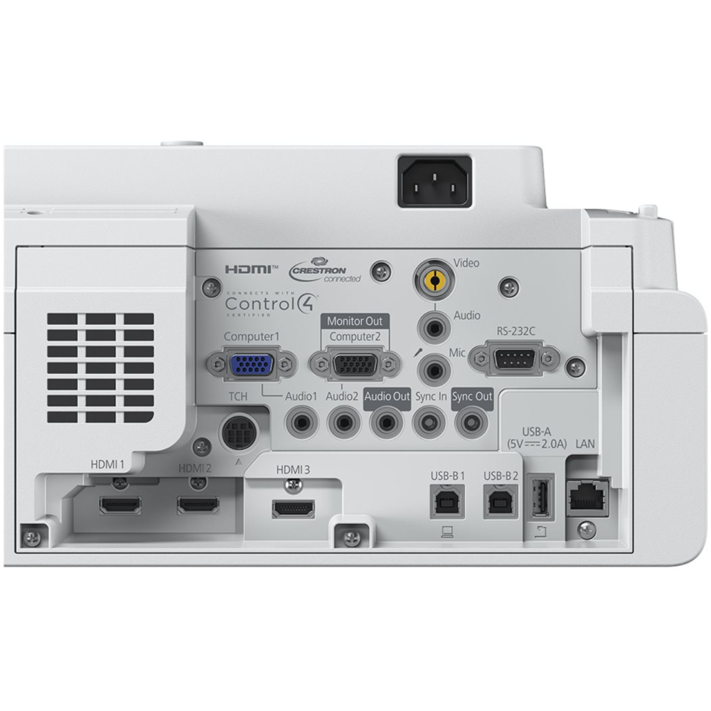 Vidéoprojecteur 3LCD avec résolution de 1920x1080 (full HD) - Intensité lumineuse de 4100 lumens ANSI avec technologie3LCD pour des couleurs plus lumineuses à seulement 205W - Mise en marche automatique, utilisation avec ou sans fil, sortie USB 2A pour smart sticks - Permet de créer et d'enregistrer une leçon ou une présentation en direct - Diagonale d'écran 49-150 pouces sans restriction - Interfaces: prise jack 305mm, entrée microphone 3.5mm, HDMI, RJ-45 - Objectif à ultra courte focale - Durée de vie de la source lumineuse 30000h - Niveau sonore 37dB - IEEE 802.11a/b/g/n/ac sans fil / LAN / Miracast - blanc.