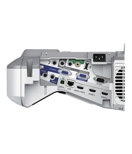 Vidéoprojecteur 3LCD avec résolution de 1920x1080 (full HD) - Intensité lumineuse de 4100 lumens ANSI avec technologie3LCD pour des couleurs plus lumineuses à seulement 205W - Mise en marche automatique, utilisation avec ou sans fil, sortie USB 2A pour smart sticks - Permet de créer et d'enregistrer une leçon ou une présentation en direct - Diagonale d'écran 49-150 pouces sans restriction - Interfaces: prise jack 305mm, entrée microphone 3.5mm, HDMI, RJ-45 - Objectif à ultra courte focale - Durée de vie de la source lumineuse 30000h - Niveau sonore 37dB - IEEE 802.11a/b/g/n/ac sans fil / LAN / Miracast - blanc.