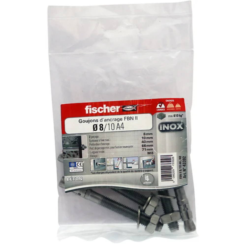 Goujon universel Fischer d’une longueur de 10 mm et d’un diamètre de 8 mm - Conçu avec un corps en acier inoxydable de type A4 présentant une forte résistance à l’oxydation - Inclut un long filetage qui offre une grande souplesse - Offre une installation facile et une capacité de charge maximale qui nécessite moins de points de fixation et des plaques d’ancrage plus petites - Peut être fixé sur tous types de surface, notamment dans le béton non fissuré.